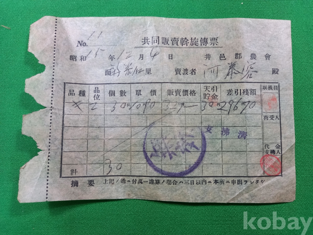 이 문서는 일본 제국 시기 발행된 농산물 공동 판매 알선 전표입니다.