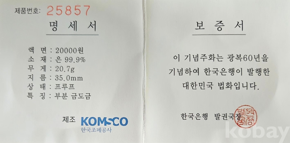 액면 20,000원의 멋진 무광프루프 은화입니다.
