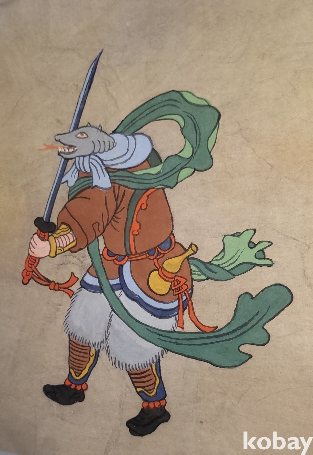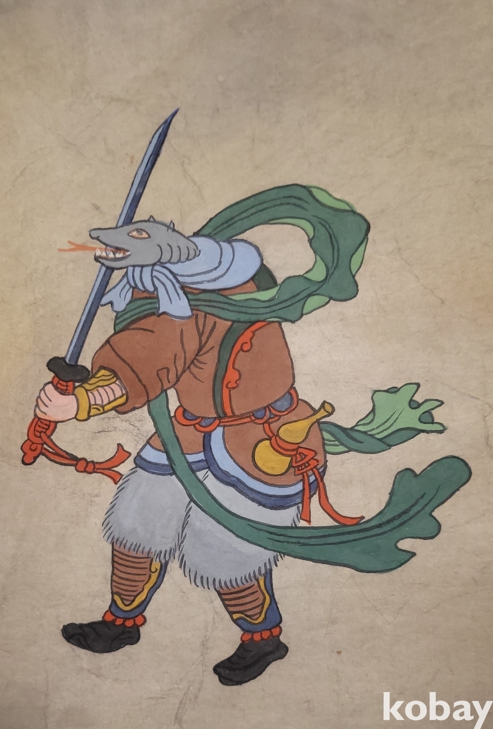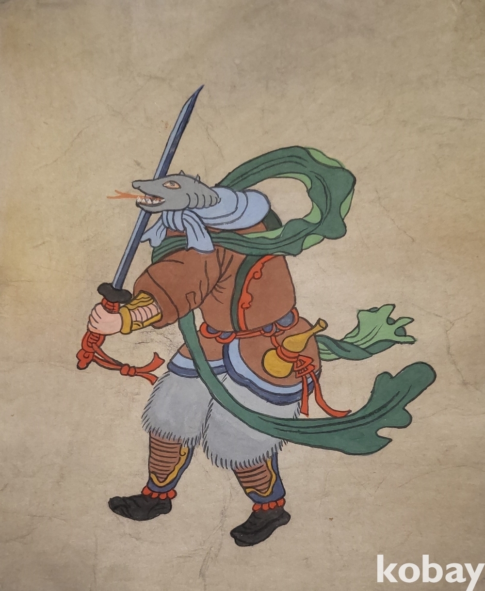 구한말 연대 갖춘 장지 바닥에 당채로 그려진 동물 형상 그림입니다,