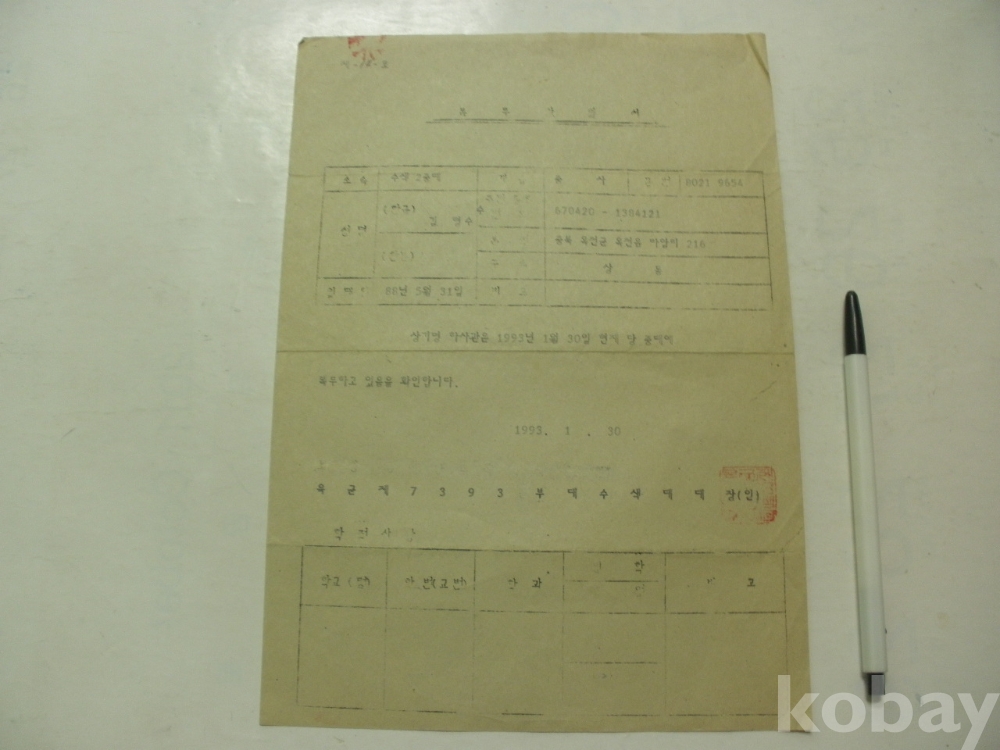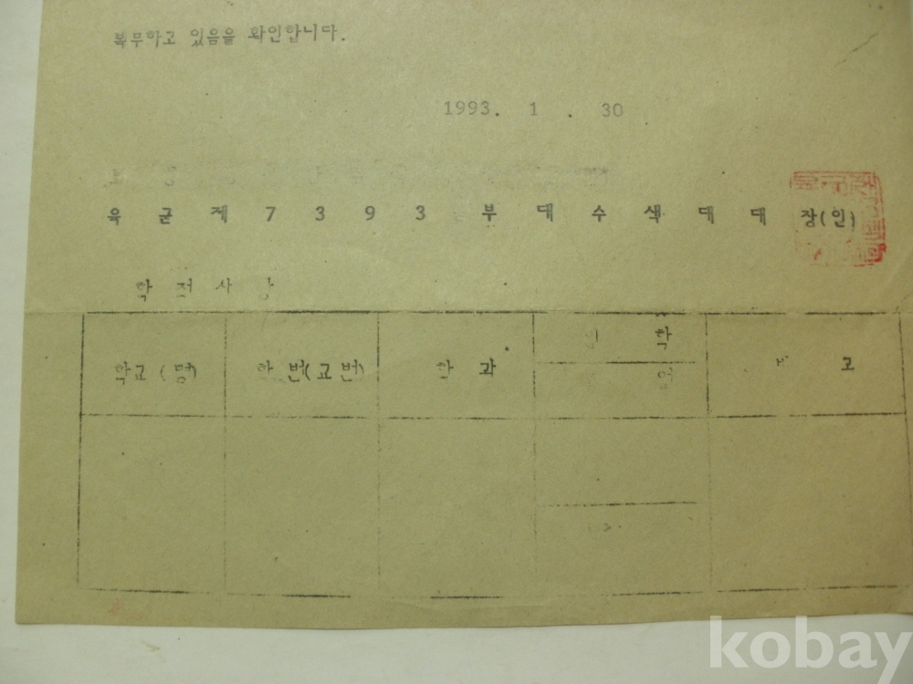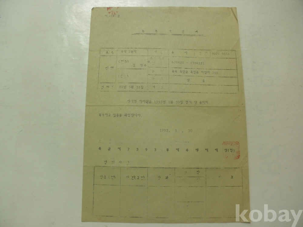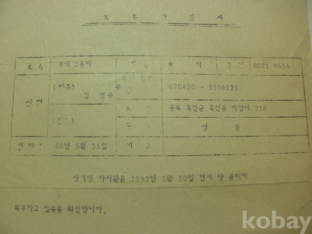 복무 확인서 (1993년, 육군부대 수색대대장)