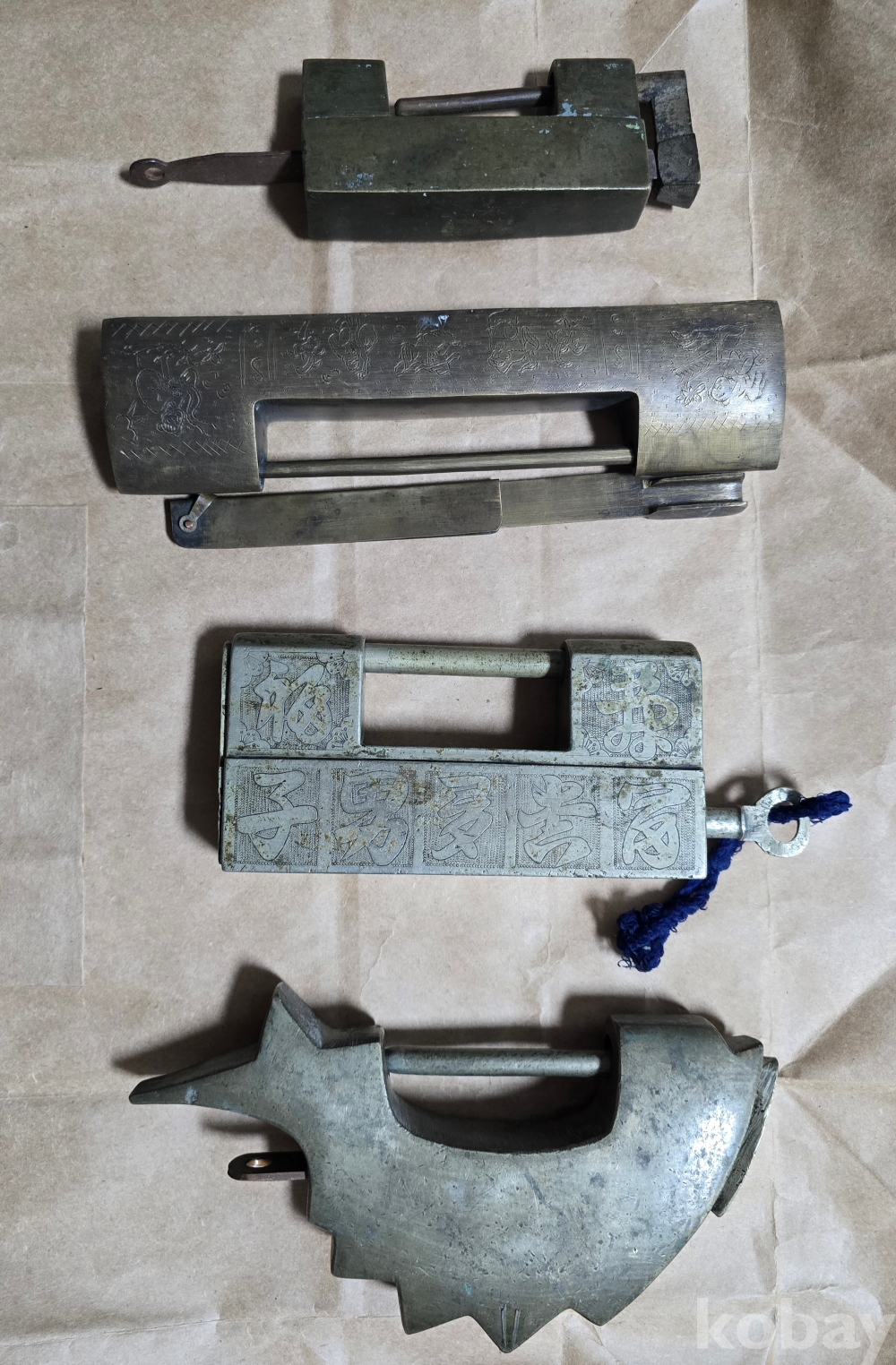 위에서 세 번째 (문자문 자물쇠): '부귀다남(富貴多男)', '수복강녕(壽福康寧)' 등의 글자가 새겨진 백동 자물쇠로,