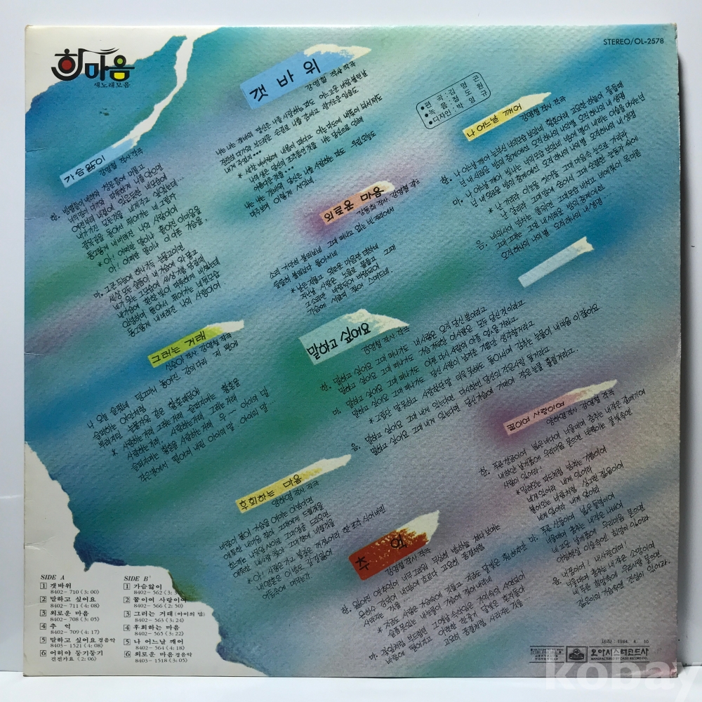 LP 22,447-49 한마음 1집 - 가슴앓이/ 갯바위 자켓 EX+ 알판 EX 84 년 국내반