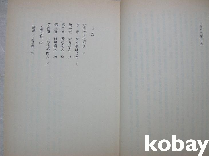 뒤표지에 지은이는 1922년생이라는 소개가 있고 같은 문고본으로 여러 소설들이 출간되었다. 서문에서 사회현상과 전쟁, 천재, 경제변동 속에서 상업도 역시 변해야 한다며 예전의 대표적인 大阪商人, 近江商人, 伊勢商人들에게서 그 영고성쇠에 깃든 역사 이면의 사실들을 통해 새로 변화된 환경에도 능동적으로 대처하는 온고지신의 지혜를 배울 수 있다고 하였다. 뒤에 다른 사람의 '해설'이 있다.