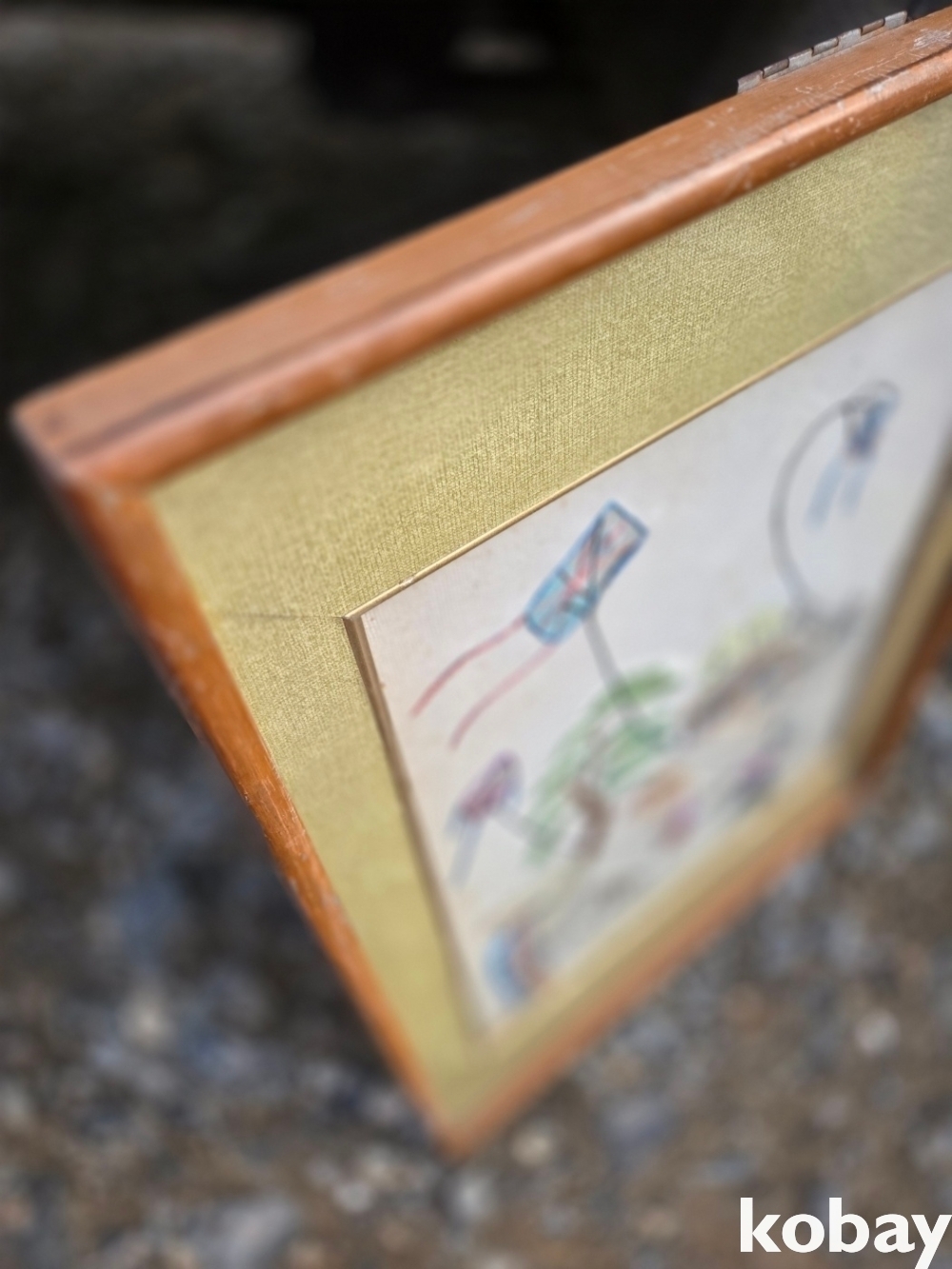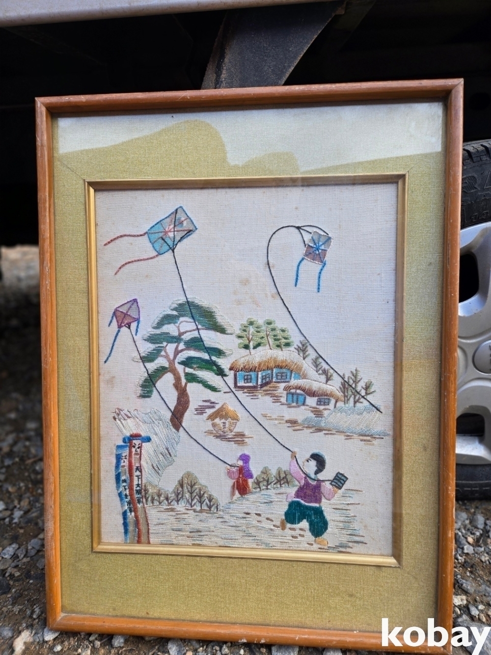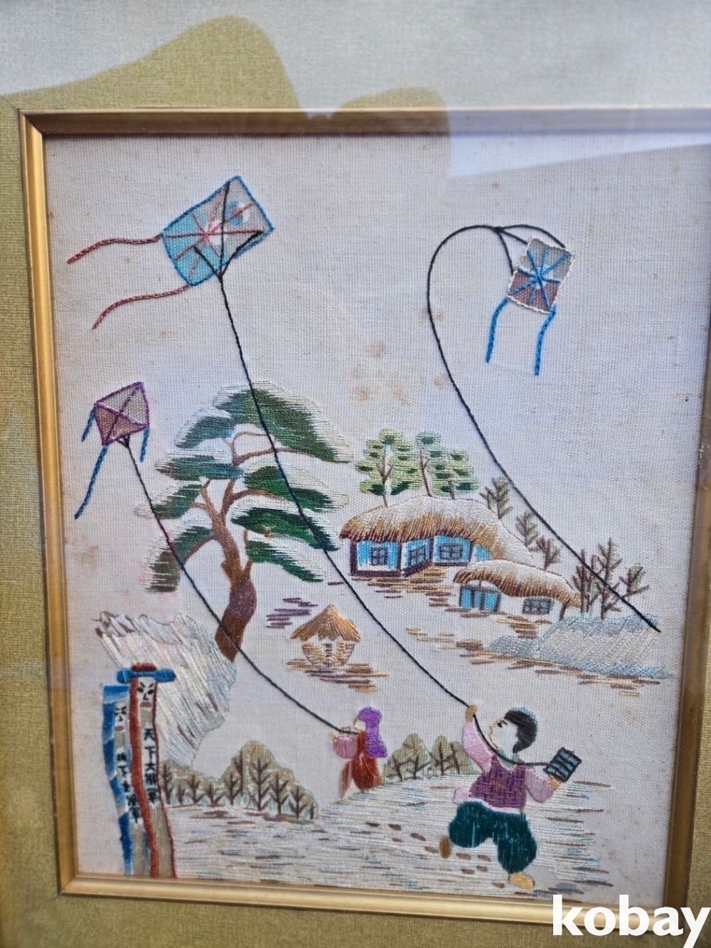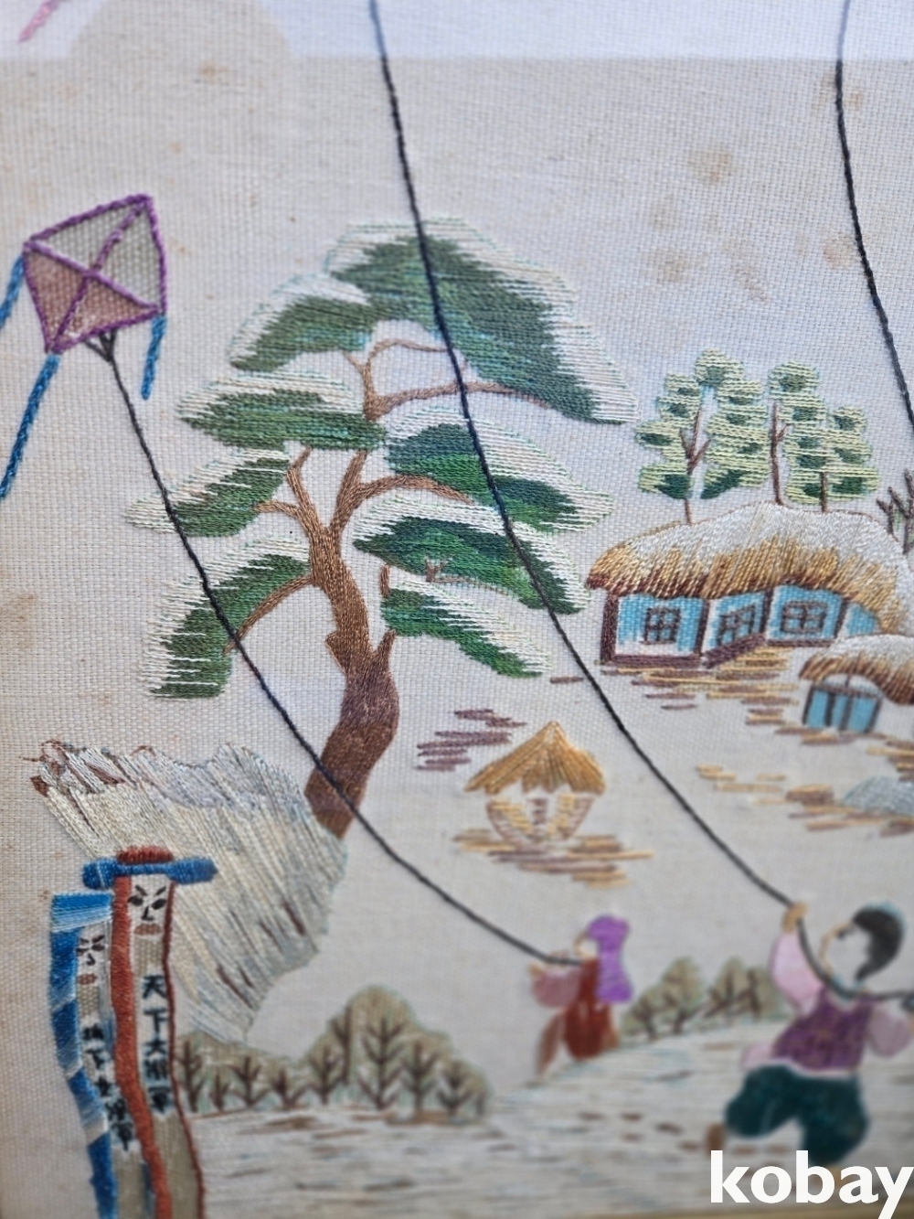 연 날리기 하고 있는 아이들 표현 자수 액자 입니다.