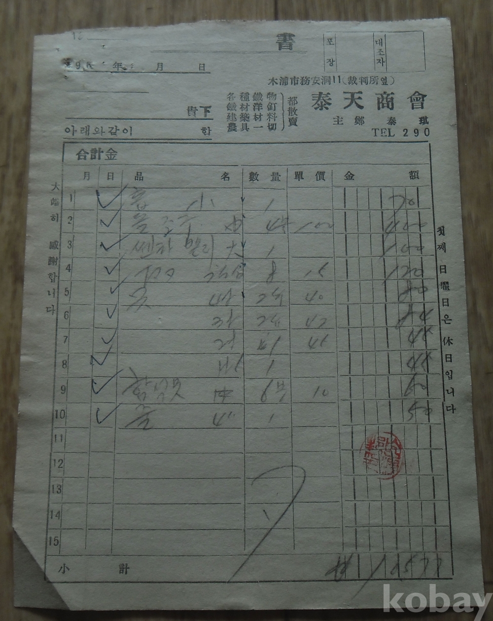 1969년 목포 태천상회 발행 계산서