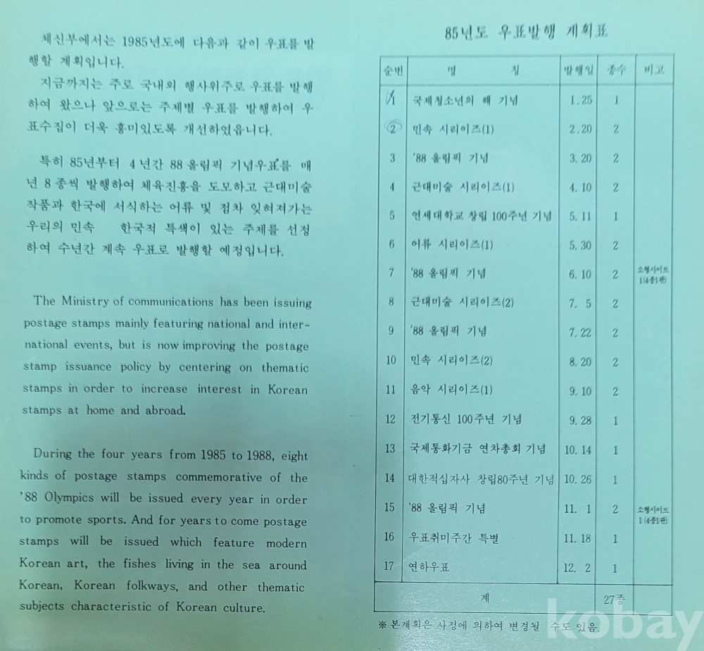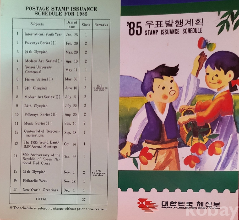 대한민국 체신부 발행 1985년 우표발행 계획표로 우표수집 애호가님들에게는 매우 귀한 보배같은 자료입니다,