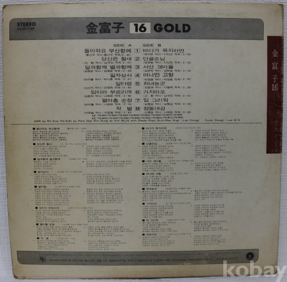 [추억의 레트로 LP음반 no.4741] 김부자 16골드 (돌아와요 부산항에) LP