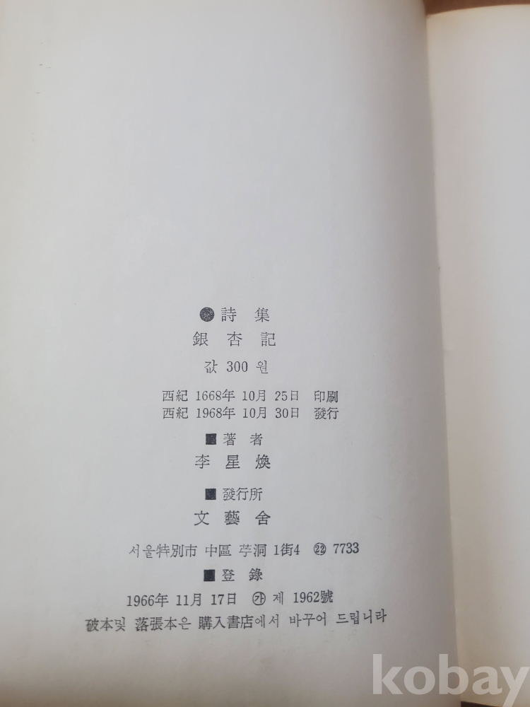 1. 은행기, 이성환, 문예사, 1968년, 84쪽, 상태 상, 사진 참조