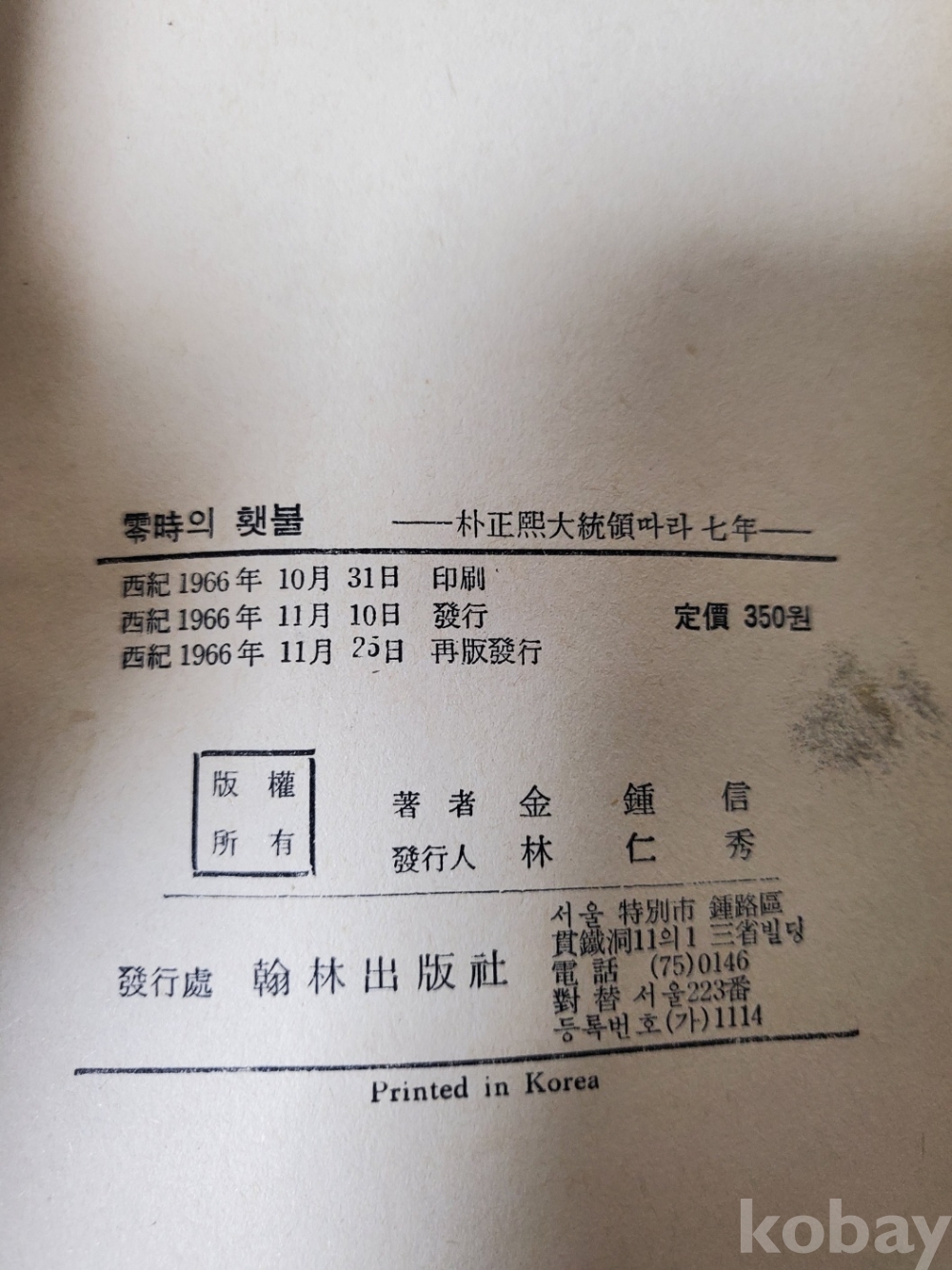 1. 영시의 햇불 - 박정희대통령 따라 7년, 김종신, 한림출판사, 1966년, 325쪽, 상태 상, 사진 참조