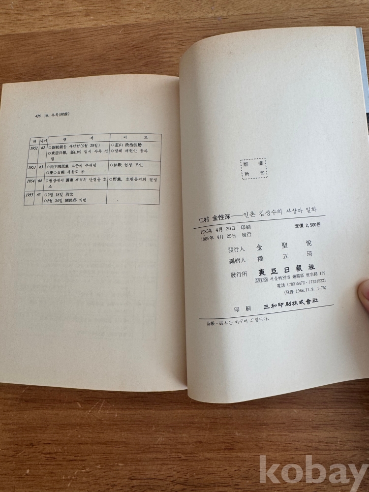 [한국현대사, 평전] 권오기, <인촌 김성수의 사상과 일화>, 동아일보사, 1985, p. 426, 상태 중급(사진참조)