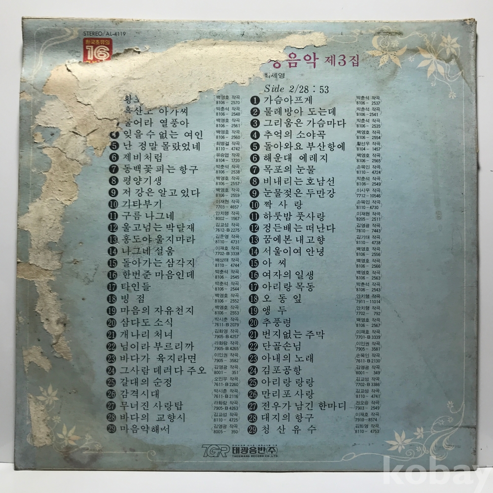 | 자켓상태 | VG : 주름, 접힘, 모서리 찢김 다수 | 음반상태 | EX : 재생에 영향 없는 가벼운 기스 존재 | 발매정보 | 알수없음 | 가사지여부 | 무 |