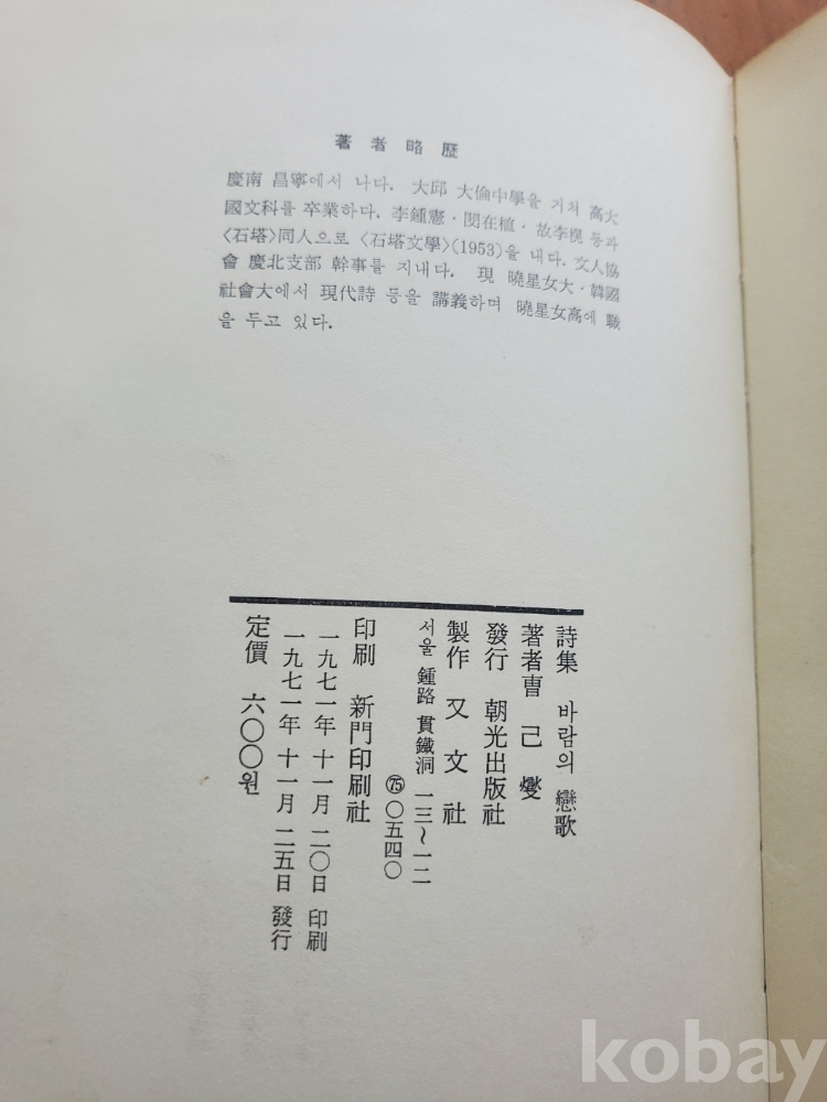 1. 바람의 연가, 조기섭, 조광출판사, 1971년, 88쪽, 상태 상, 사진 참조