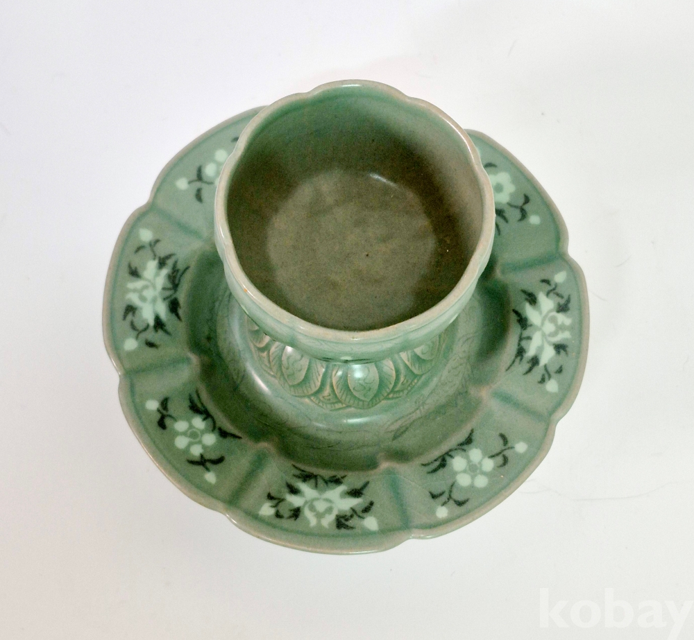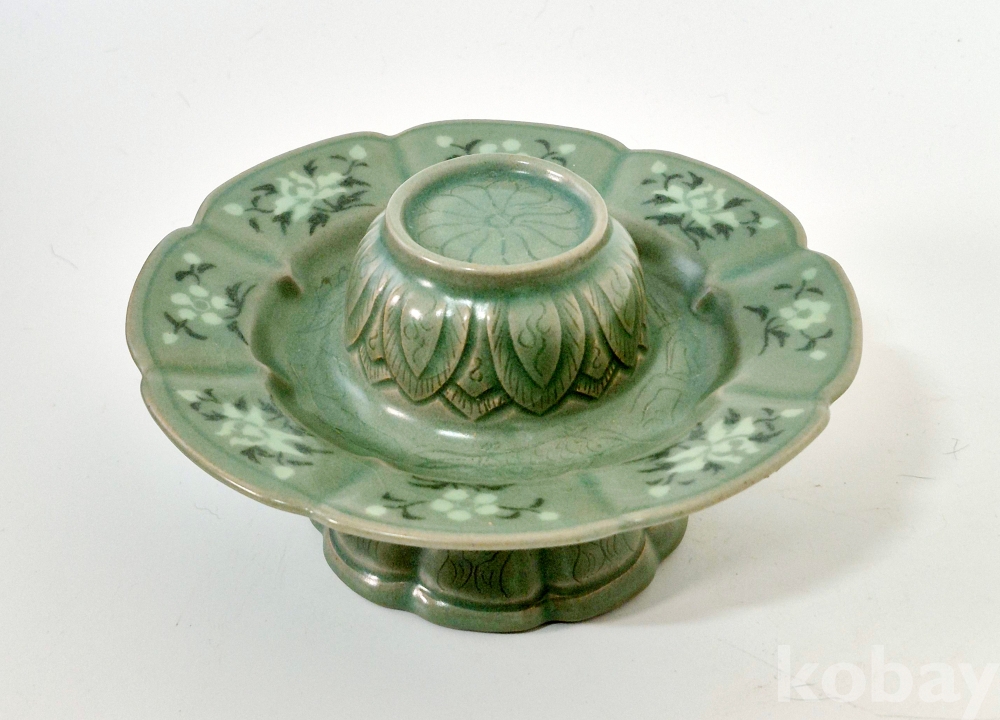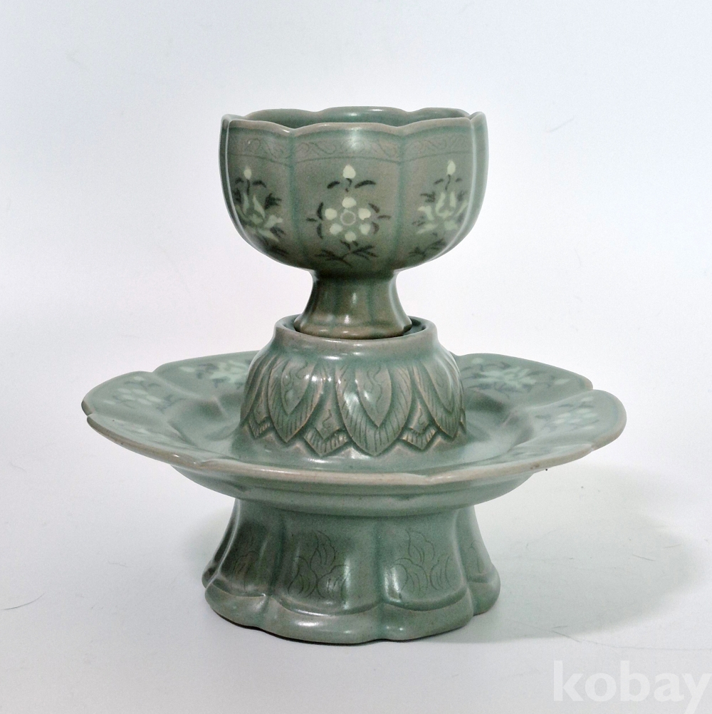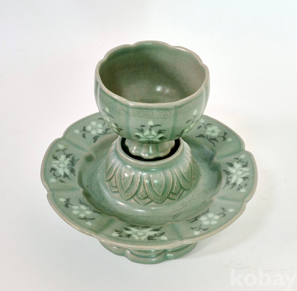 잔과 잔대는 8등분 하여 8능을 바탕으로, 흑백상감으로 잔과 잔대에 8개의 꽃을 수놓았으며, 정교하게 엽문을 양각하였고, 물고기를 음각해 놓았습니다.