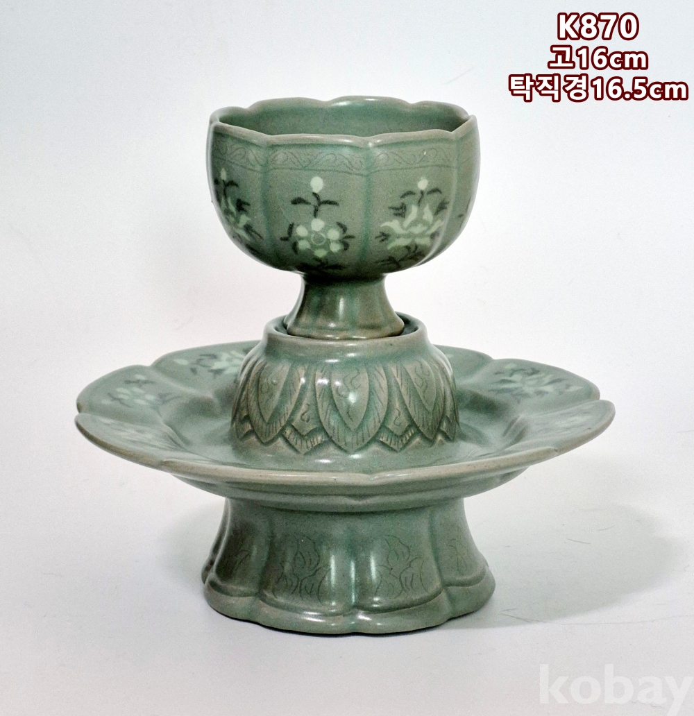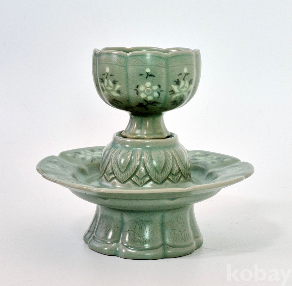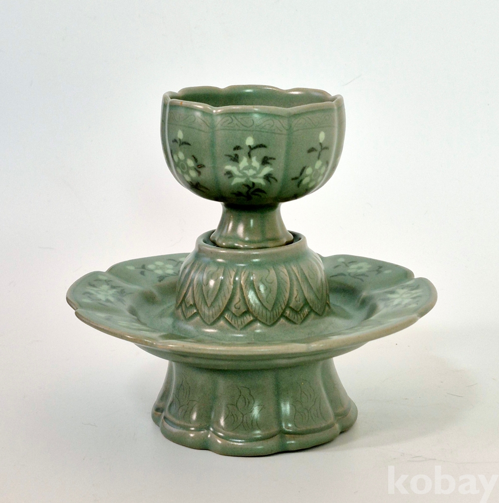 잔과 잔대는 8등분 하여 8능을 바탕으로, 흑백상감으로 잔과 잔대에 8개의 꽃을 수놓았으며, 정교하게 엽문을 양각하였고, 물고기를 음각해 놓았습니다.