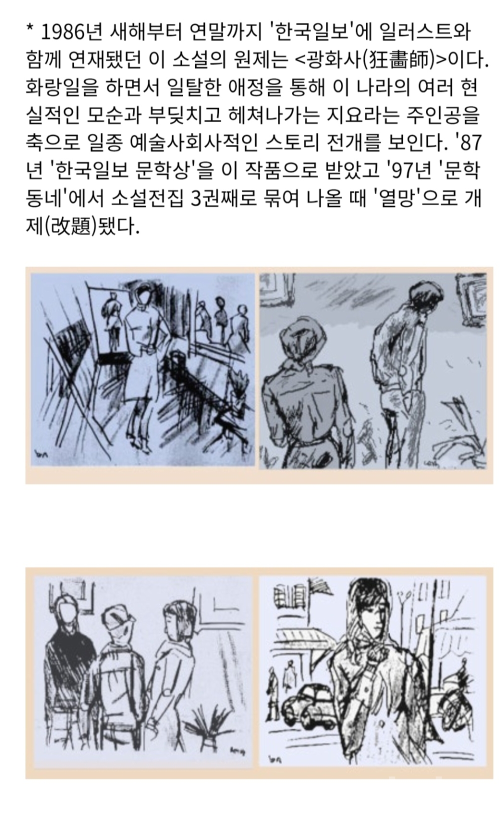 <광화사>작품은 한국일보 연재를 끝낸후 <열망>이라는 3권완질로 1987년 한국일보문학상에 당선됩니다.