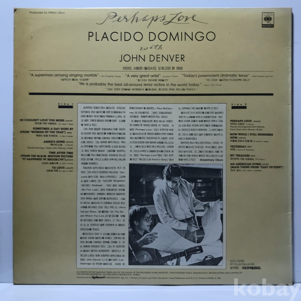 LP 21,950-112 Placido Domingo & John Denver - Perhaps Love 82 지구 자켓 EX 알판 VG+