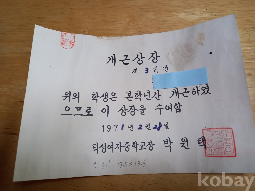 신 301) 1971년 개근상장 / 덕성여자중학교장