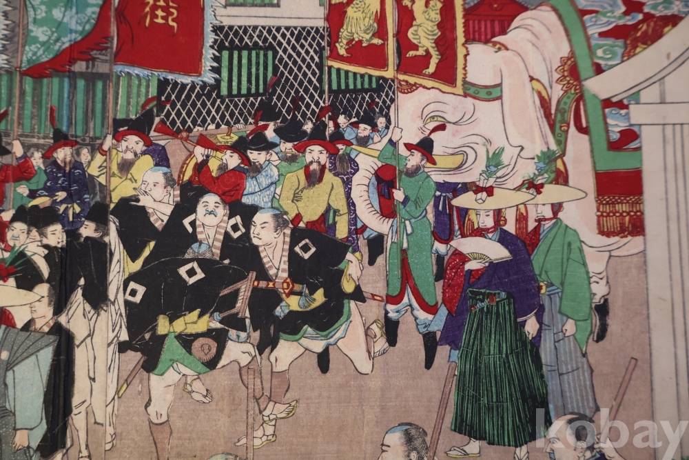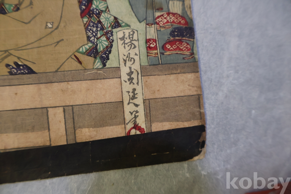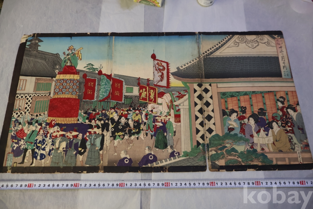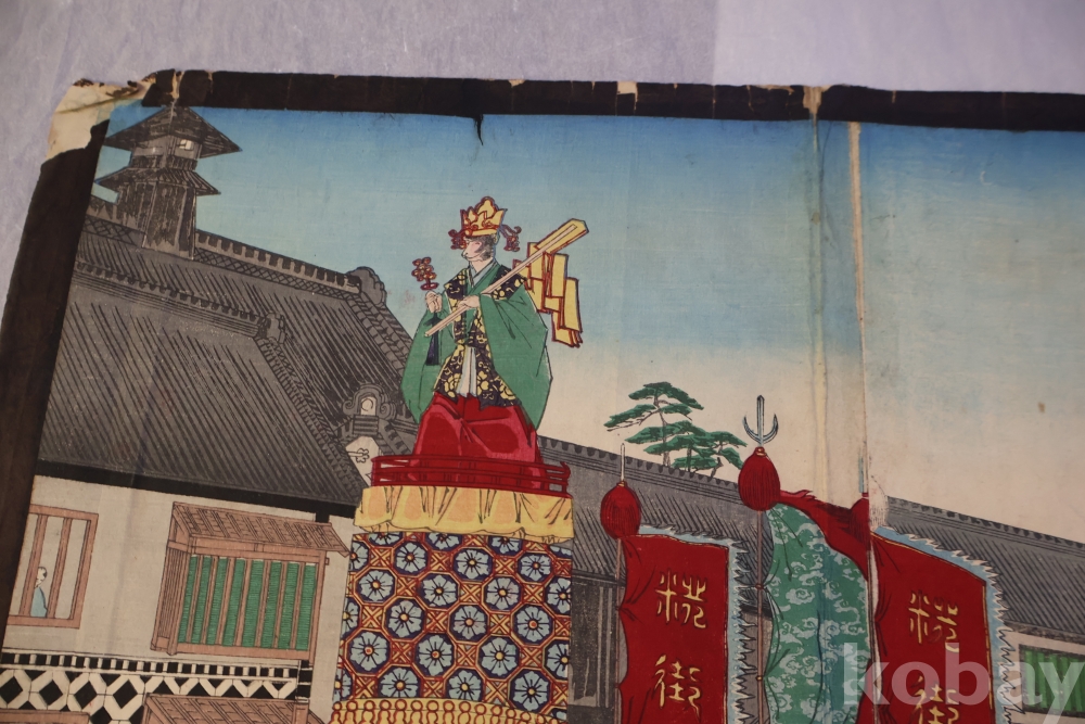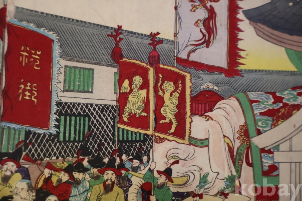 일본 목판화 원본 3 세트 임니다 세월의 흔적을 가진 고미술 목판화 이며 발행 년도와 화가의 낙관을 가진 극히 귀한 소제를 가진 명품 임니다 화가는 치가노부 [조선 통신사가 보이는 목판화 3 세트 명치 22 1889 뒤에는 배접 종이가 보임니다