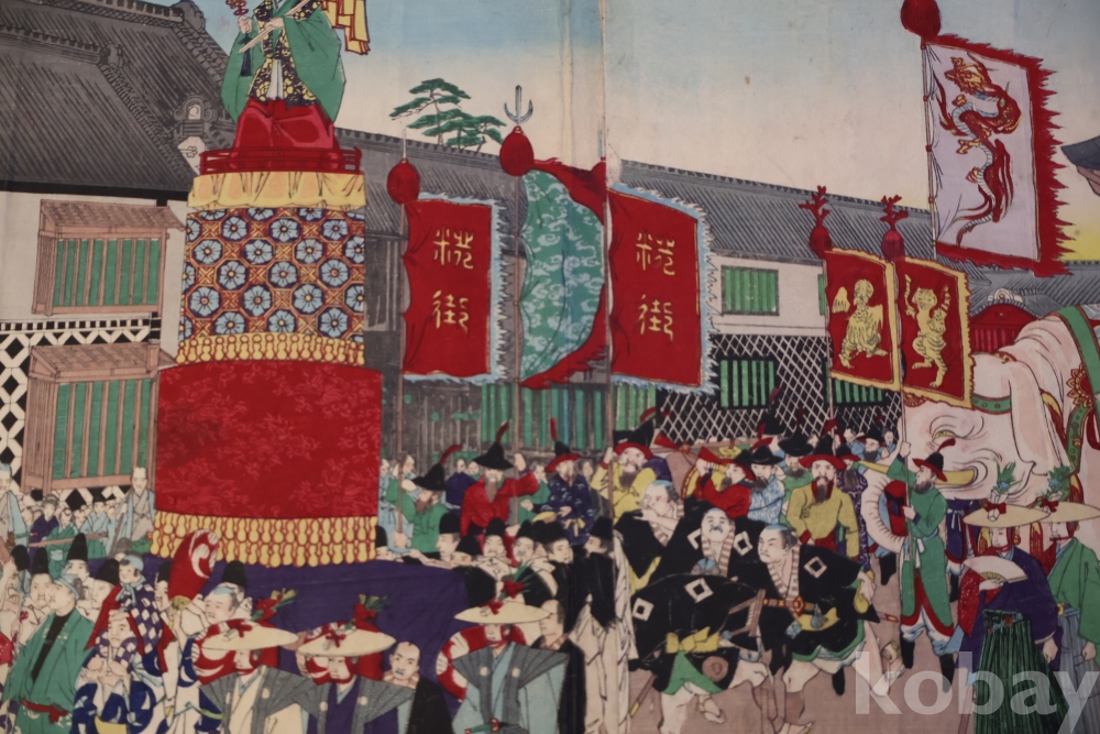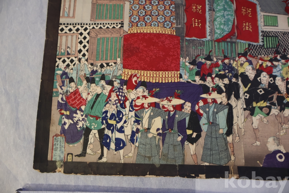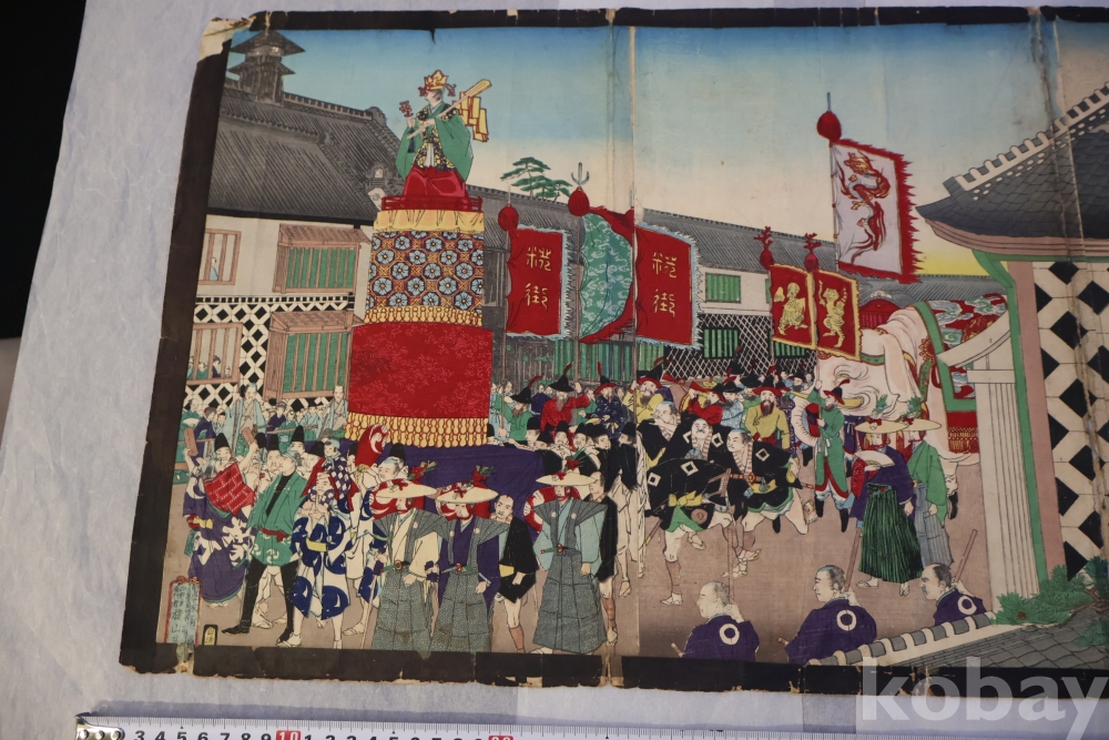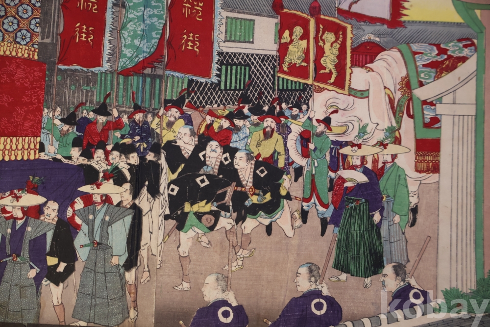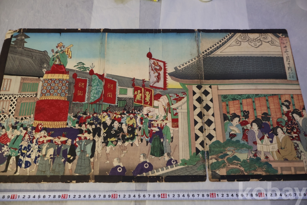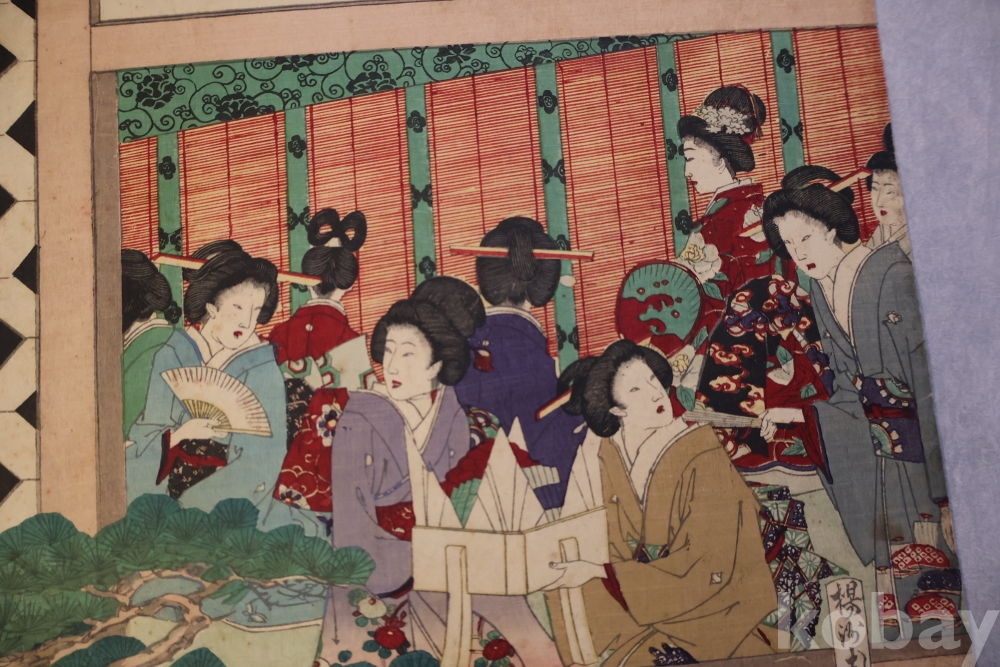 일본 목판화 원본 3 세트 임니다 세월의 흔적을 가진 고미술 목판화 이며 발행 년도와 화가의 낙관을 가진 극히 귀한 소제를 가진 명품 임니다 화가는 치가노부 [조선 통신사가 보이는 목판화 3 세트 명치 22 1889 뒤에는 배접 종이가 보임니다