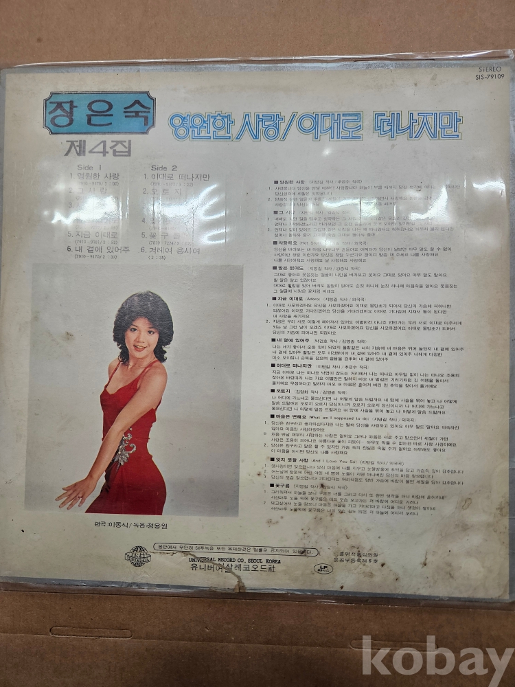 | 자켓상태 | VG : 주름, 접힘, 모서리 찢김 다수 | 음반상태 | EX : 재생에 영향 없는 가벼운 기스 존재 | 발매정보 | 알수없음 | 가사지여부 | 무 |