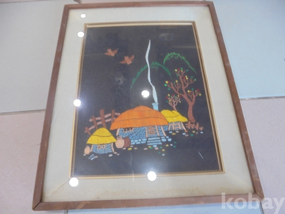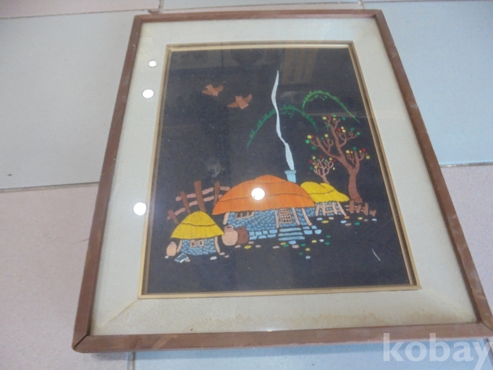 잘보관하여 깨끗한 농촌초가집풍경을 수준높게 잘표현한 손수로두텁게 잘놓은 정말옛날 정감이가는 추억어린 농촌풍경손수액자