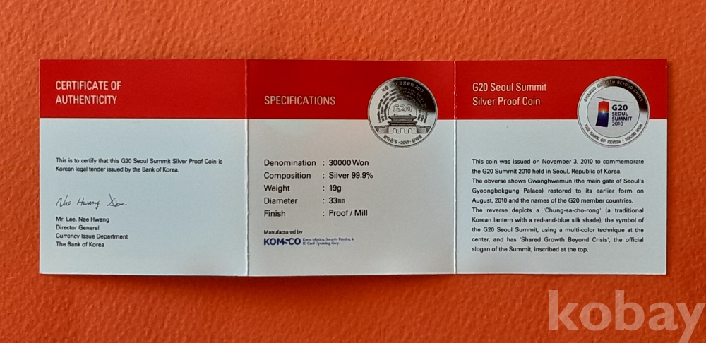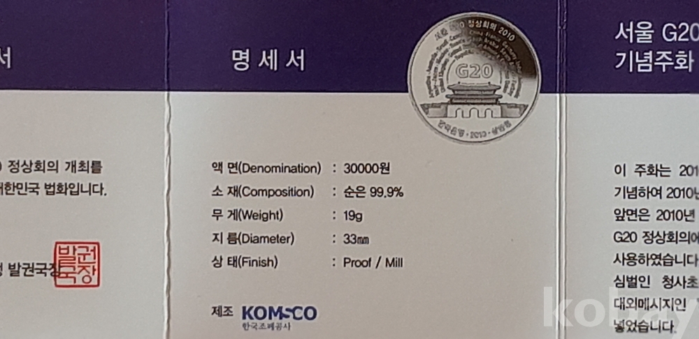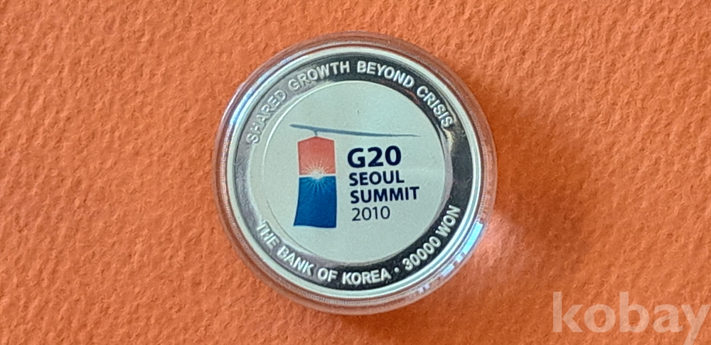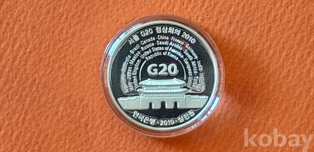 2010년 서울 G20 정상회의 무광프루프 기념주화 입니다.