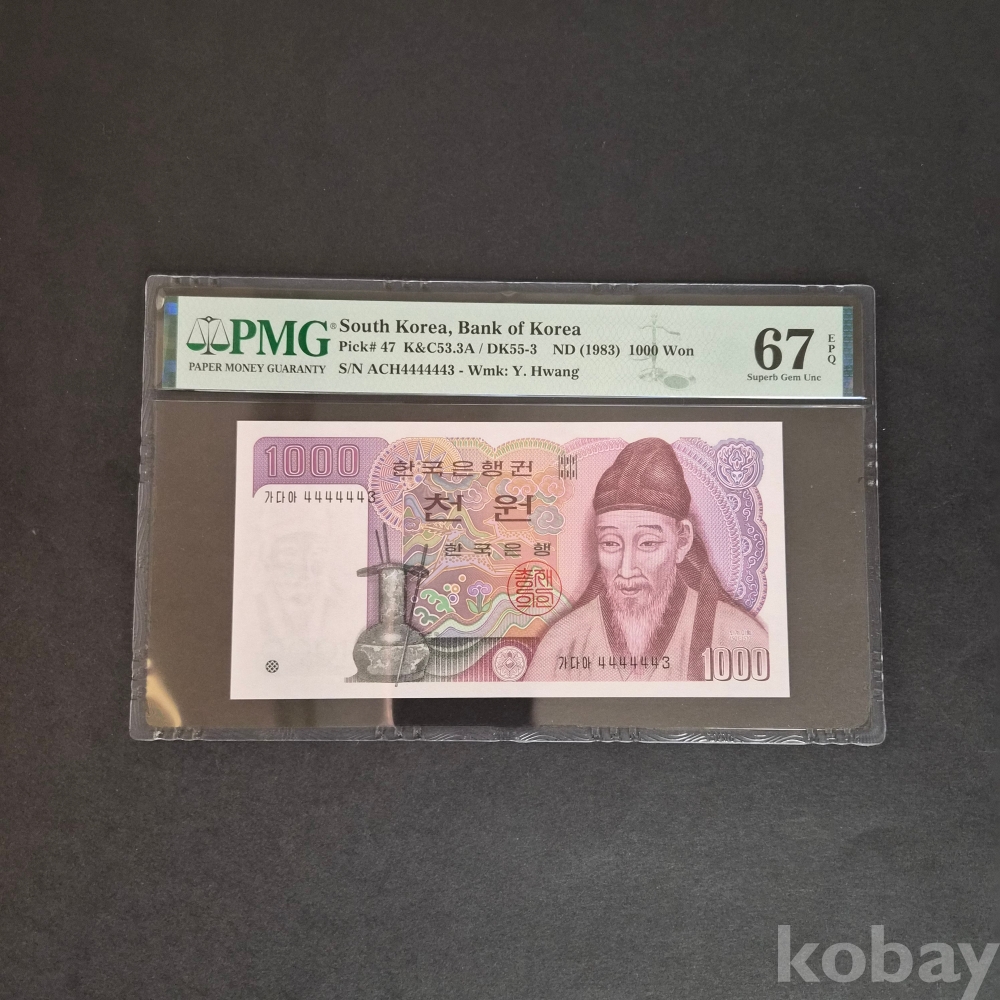 한국은행 2차 천원 양성권 PMG #67 등급 준솔리드 노트 입니다