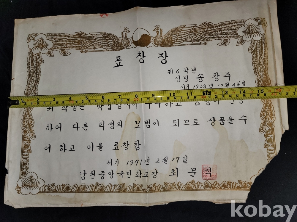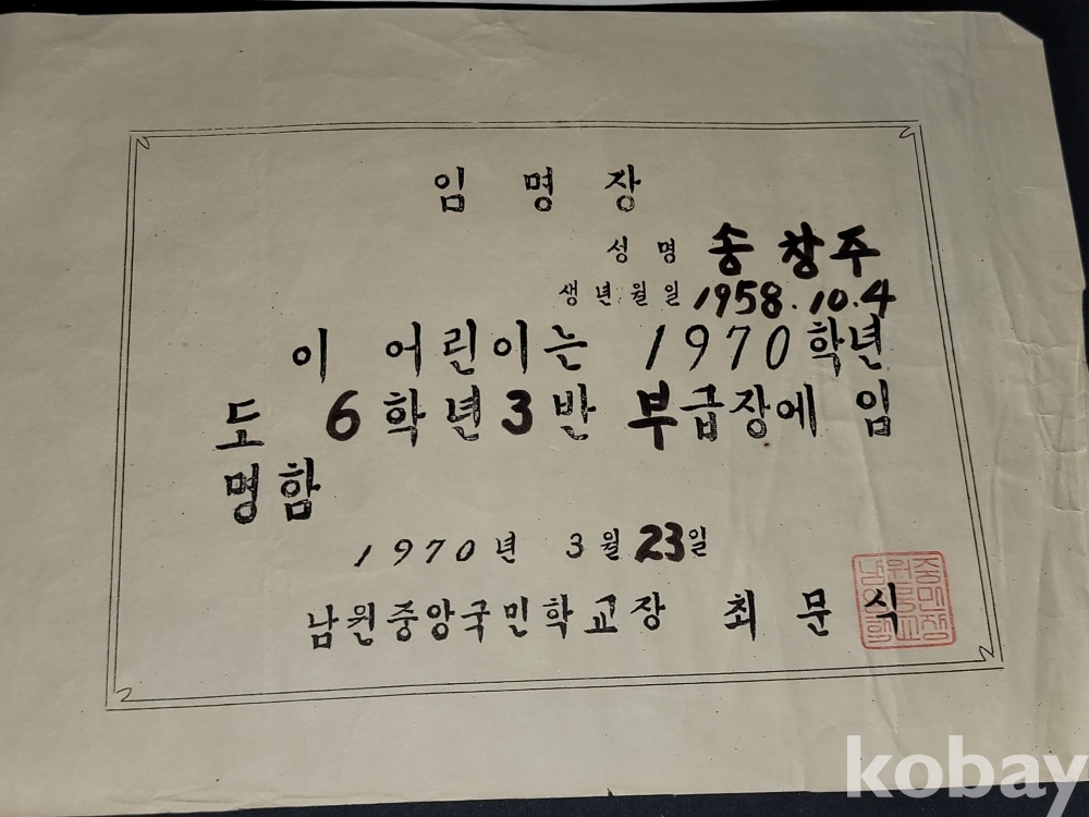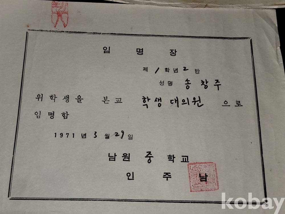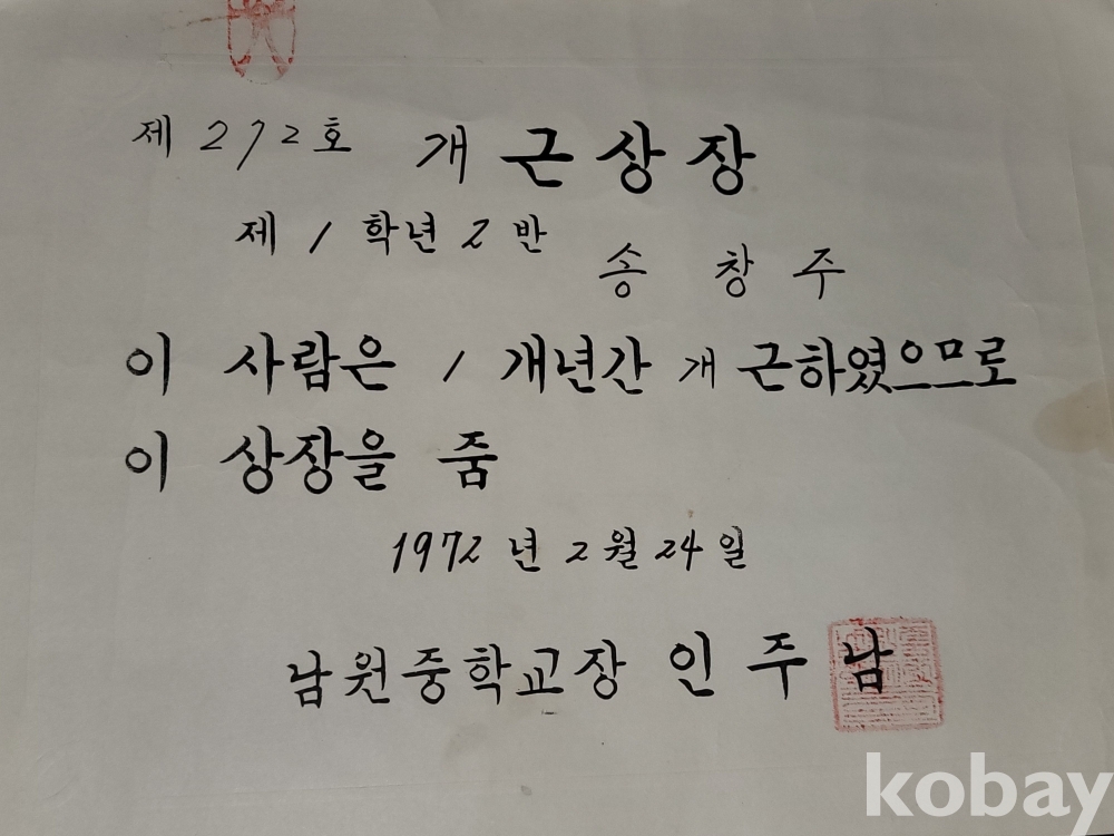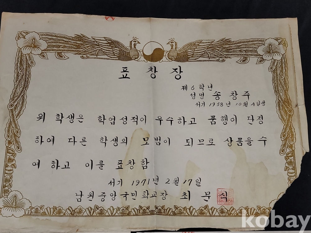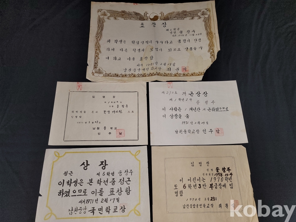 1971년 남원중앙국민학교 개근상과 표창장, 1970년 남원중앙국민학교 부급장 임명장, 1972년 남원중학교 개근상장, 1971년 남원중학교 대의원 임명장 등 일괄