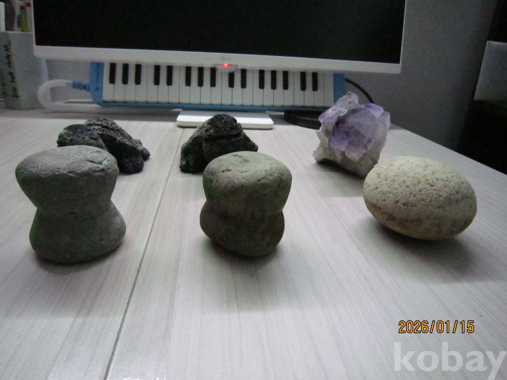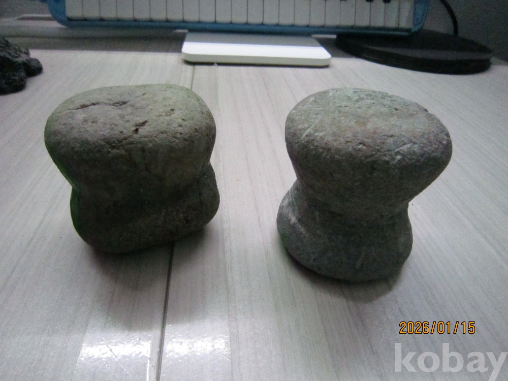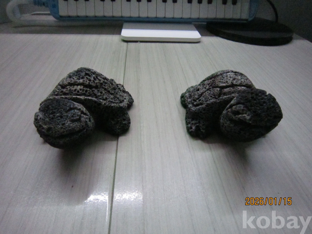돌거북이 한쌍 - 13 cm. 고드렛돌 - 6 cm. 둥근돌 - 9 cm. 자수정 - 9 cm.