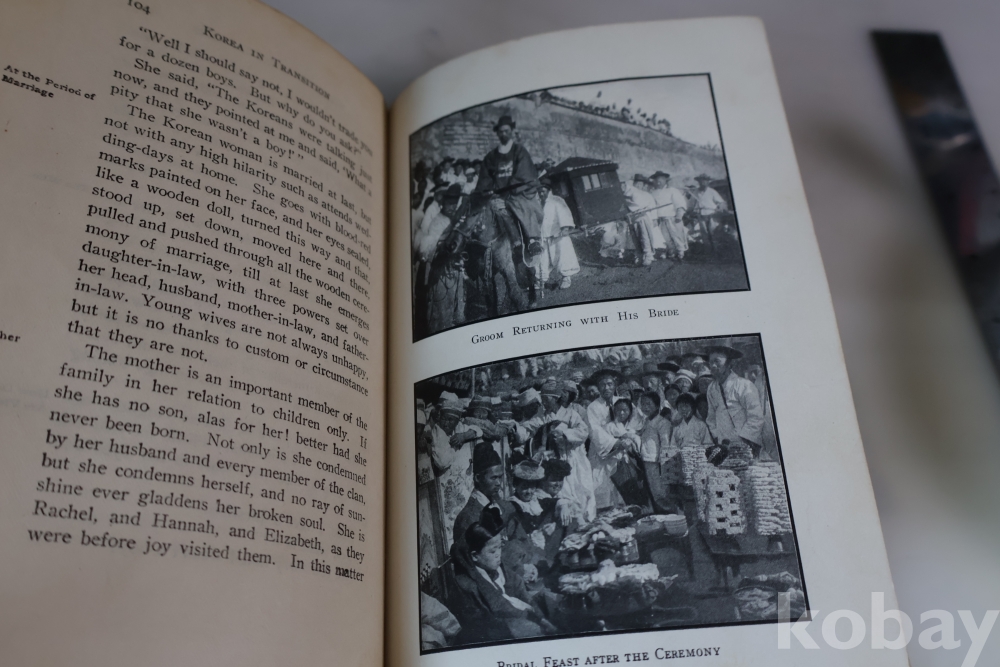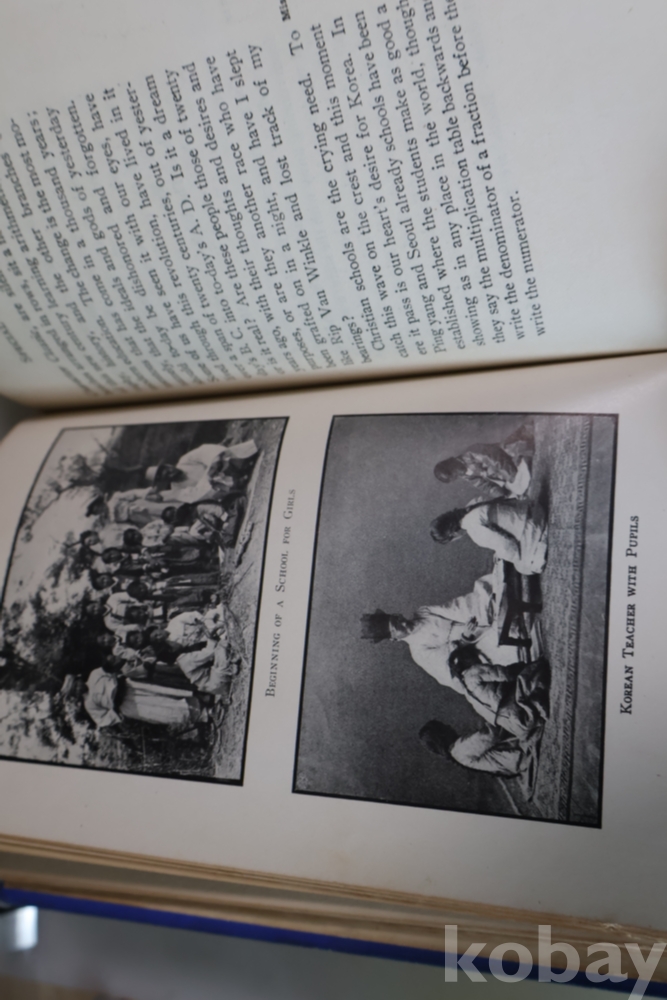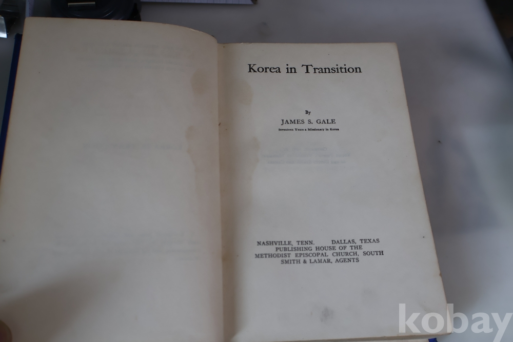 1909년도 발행 게일 목사님의 책임니다 270페이지에 걸쳐 당시 조선의 과도기? 등을 귀한 사진과 힘께 만든 귀한 책 이며 표지는 세월의 흔적이 보이는 초판본 임니다 영어책 이며 당시에 전 세계에 조선을 알린 귀한 명저 임니다 KOREA IN THE TRANSITION 제임스 게일 세월의 흔적을 가진 낙장없는 명저 임니다