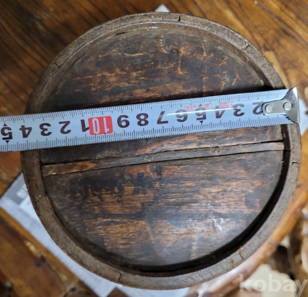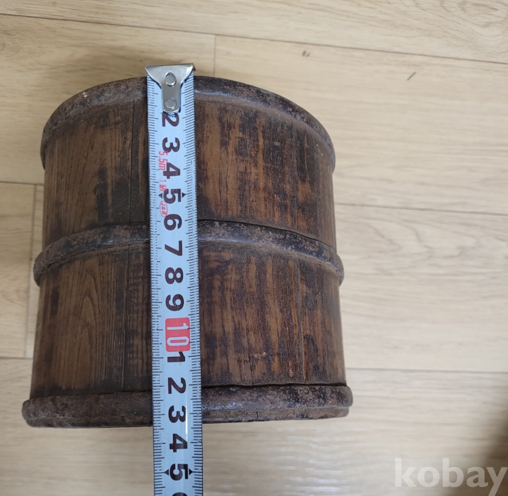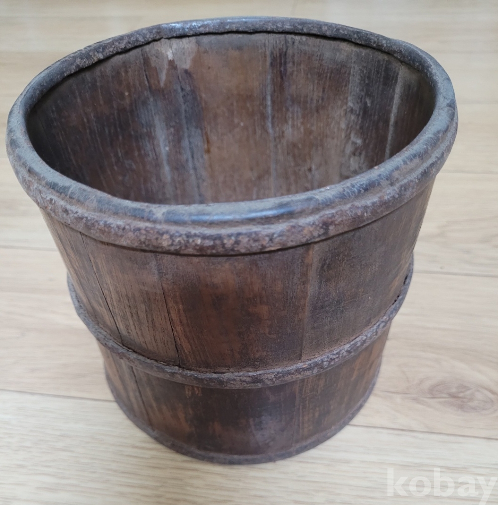 상단과 하단에 나무 또는 금속 띠가 둘러져 있어 형태를 고정하고 있습니다. 나무 표면에는 깊은 나뭇결과 함께 오랜 세월 사용되면서 생긴 마모, 갈라짐, 그리고 검게 변색된 부분이 두드러집니다.