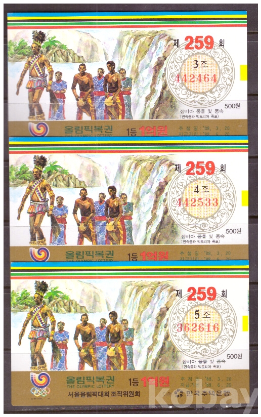 (서울올림픽) 1988 서울올림픽복권 제259회 3,4,5조 잠비아 풍물 및 풍속(민속춤과 빅토리아폭포)
