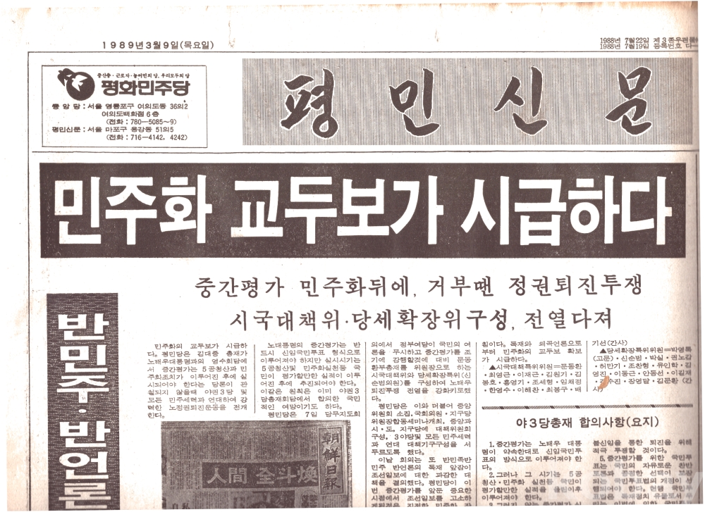 3. 1989년 평민신문 (발행인: 김대중 총재) - 4면 발행