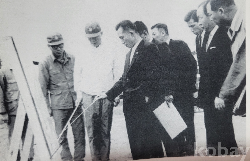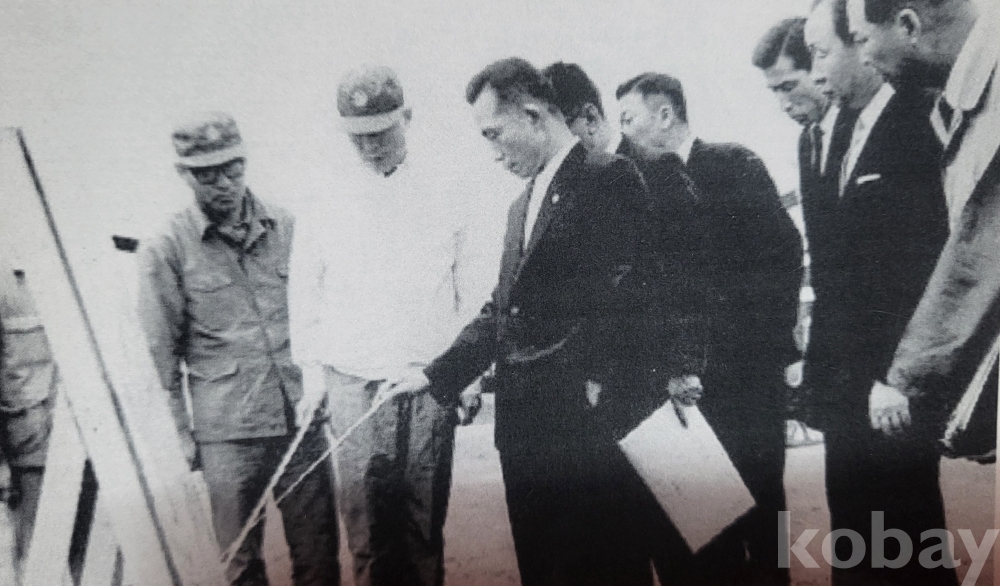 박정희 대통령께서 수행원과 함게 시찰 중 찰영한 명장면 흑백 사진입니다,