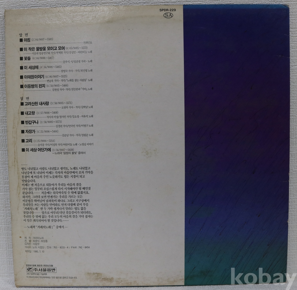 | 자켓상태 | EX : 약간의 마모, 모서리 찢김 존재 | 음반상태 | G : 눈에 띄는 스크래치, 튐 또는 노이즈 발생 | 발매정보 | 초반 | 가사지여부 | 유 |