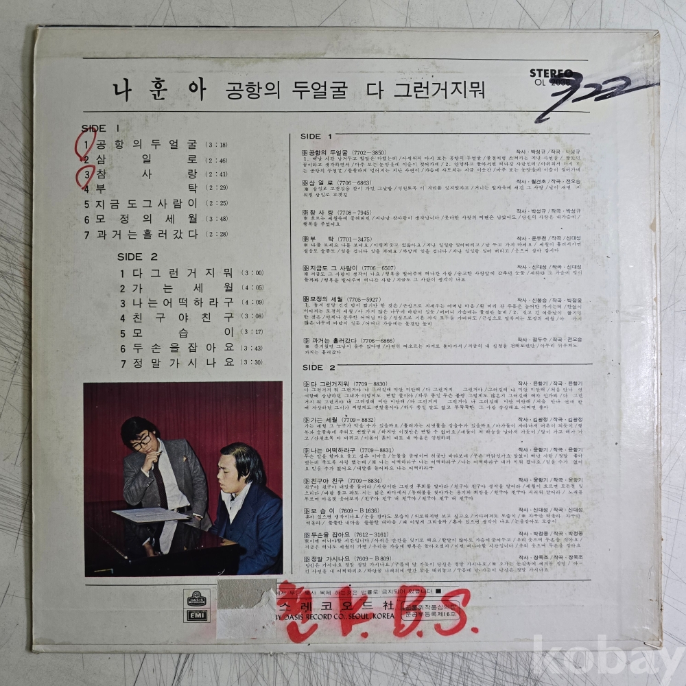 | 자켓상태 | VG : 주름, 접힘, 모서리 찢김 다수 | 음반상태 | VG : 생활 기스 다수, 가벼운 노이즈 존재 | 발매정보 | 초반 | 가사지여부 | 무 |