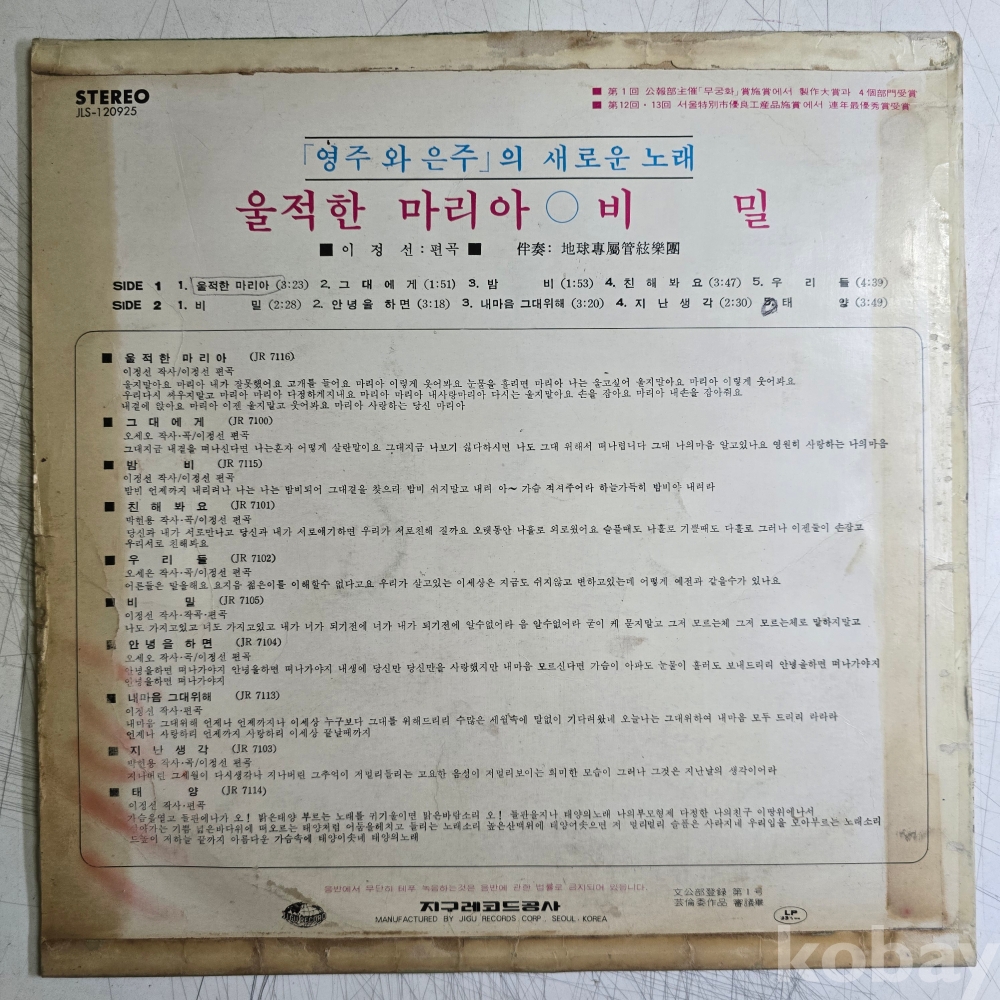 | 자켓상태 | VG : 주름, 접힘, 모서리 찢김 다수 | 음반상태 | VG : 생활 기스 다수, 가벼운 노이즈 존재 | 발매정보 | 초반 | 가사지여부 | 유 |