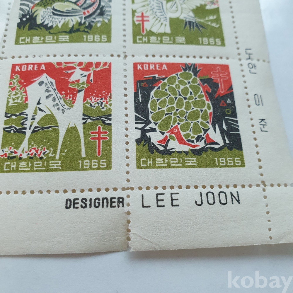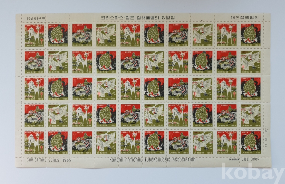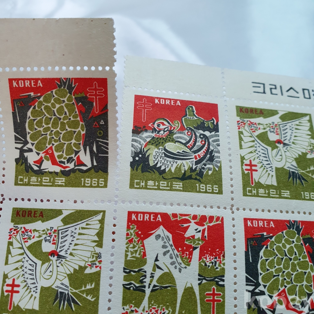 1965년 크리스마스씰. 민속화 사슴 거북 원앙 학. 4종연쇄. 전지