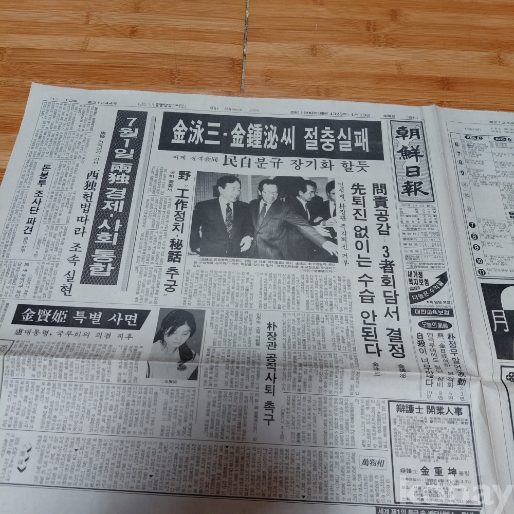 삼성카메라 ㆍ김영삼 김종필 절충실패 정치면 메인기사 조선 90년4월13일 올려드립니다
