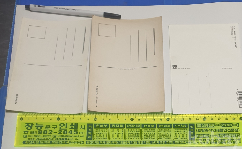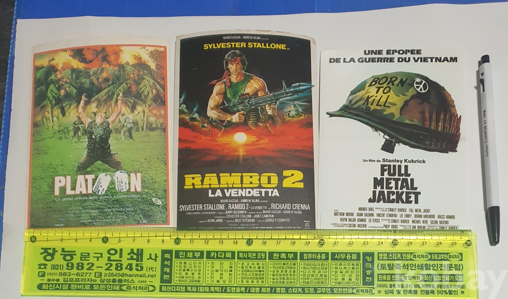 화제의 영화 람보와 전쟁영화의 대표작 플라톤 메탈쟈켇 영화 엽서3점.