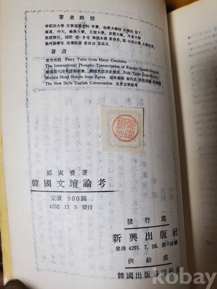 1. 한국문단논고, 정인섭, 신흥출판사, 1959년, 249쪽, 상태 상, 사진 참조