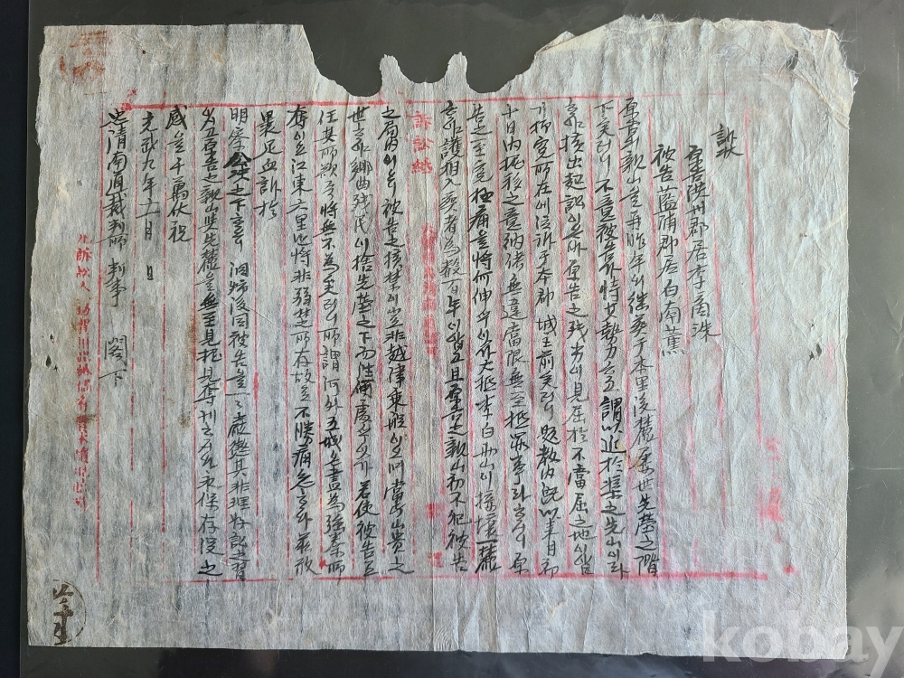 光武9년 11월 訴狀 용지에 쓴 洪城郡 송지곡면(松枝谷面)에 거주한 원고가 보령 남포에 거주한 피고에게 낸 고소장으로 忠淸南道 裁判所 判事 각하의 처분을 바라는 訴狀이다