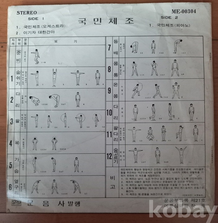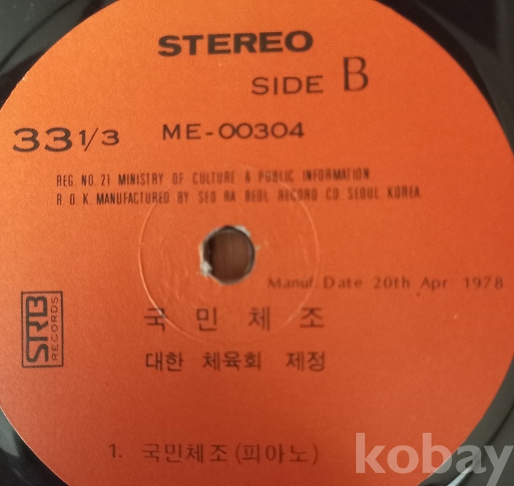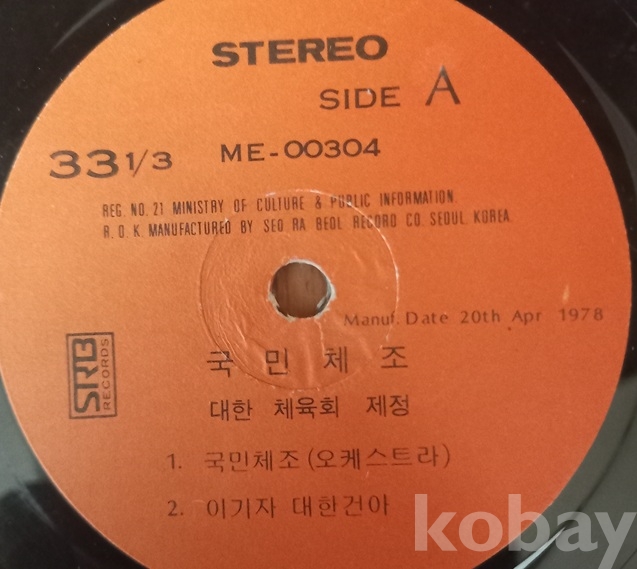 쟈켓과 디스크 모두 세월에 비해 너무 좋아 보입니다. 국내 체조음반은 1950년 무렵 일본으로부터 "라디오체조" 수입을 추진중에 6.25동란으로 중단되고 이후 군사정부의 "재건체조"반, 그리고 이 "국민체조"반, "신세기체조"반도 있었다 하고.. 한편 군에서는 따로 "국군도수체조"반이 나왔고 그 외 일설에는 "가정체조"반도 있었다 하는데 저는 구경도 못하고.. 점점 귀해져 가는 자료들로서 소중한 음반들입니다. 쟈켓의 앞장 중앙에 "사단법인 대한체육회"의 로고? 뺏지? 그림도 보입니다. 트랙 등 모든게 사진에 다 있읍니다 아주 여러장을 올렸읍니다.