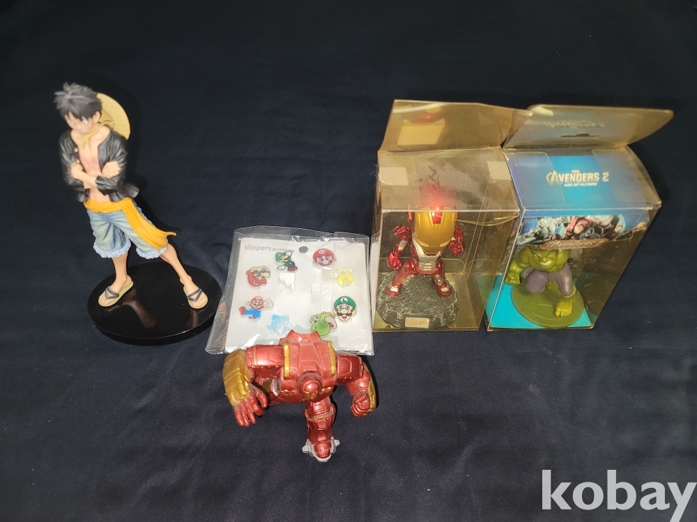 각종 피규어 원피스 루피, 마블 아이언맨, 헐크, 슈퍼마리오 장식 등 5종 일괄입니다.