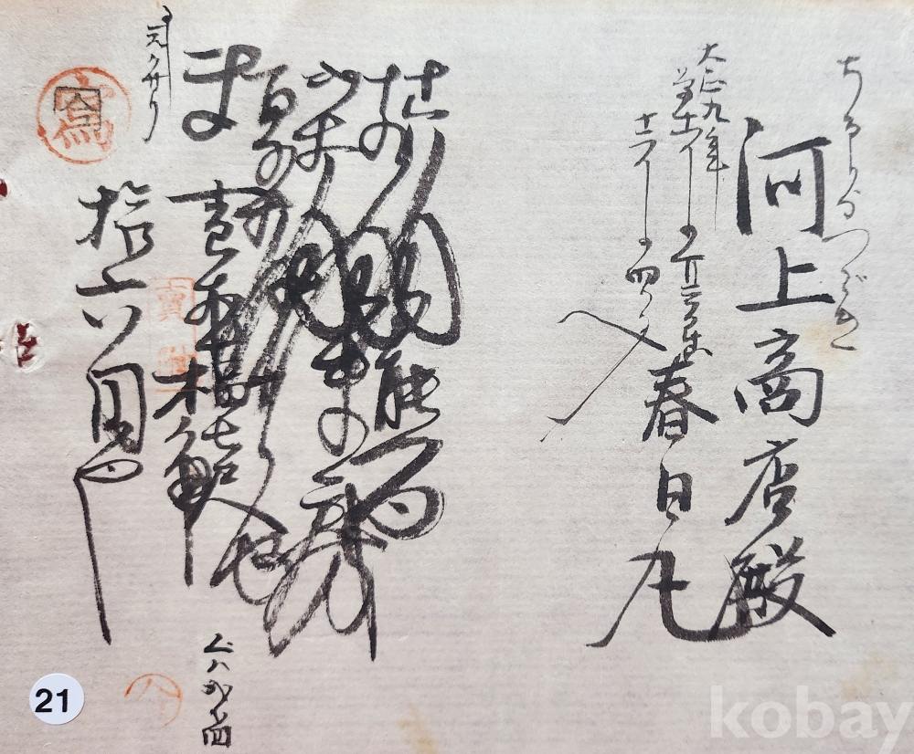Tㅡ21 호책상 下 특별호 노랑봉투 번 ////// 서기 1921년 = 대정 10년 표지가 보이는 종이에 직접 기록한 명인(名人)들의 방명록 서체입니다,