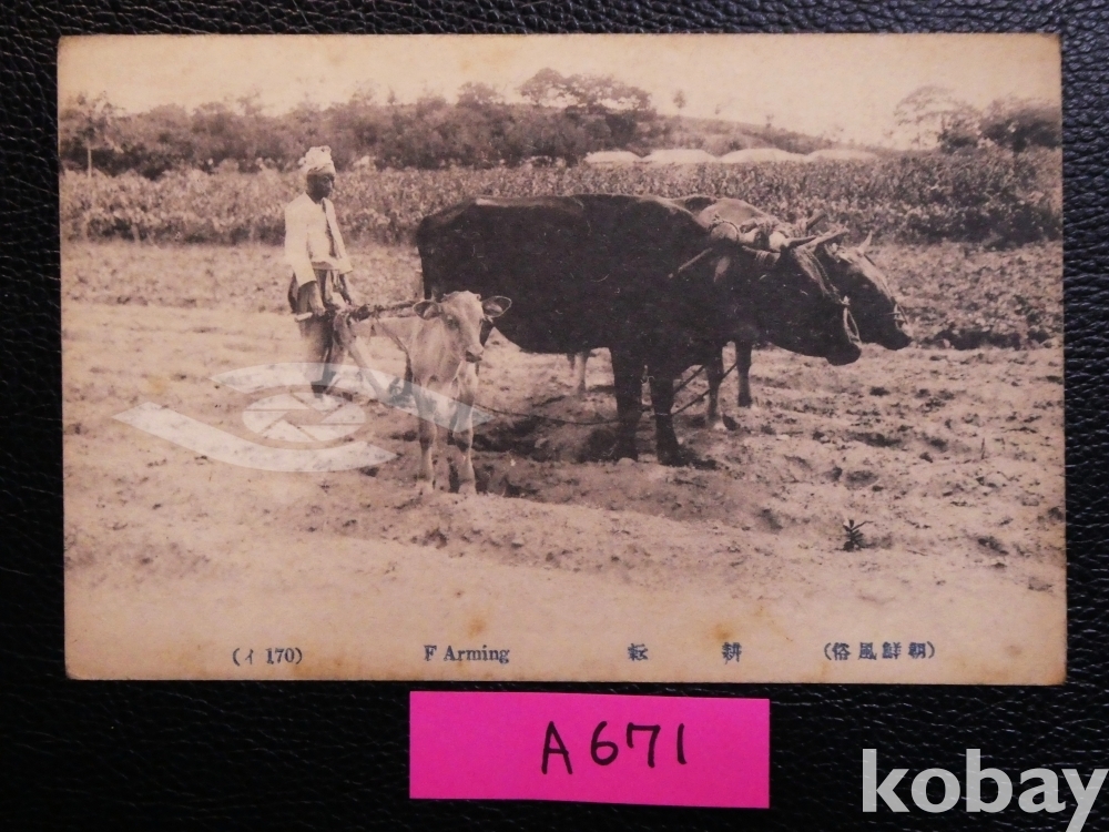 ▣근대한국엽서(진본): [조선풍속] 조선인의 농경 모습, 우경, 소 3마리/1매/역사자료/일제강점기 사진엽서, 그림엽서, 회엽서. A671