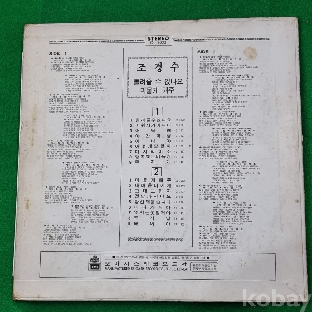 | 자켓상태 | EX : 약간의 마모, 모서리 찢김 존재 | 음반상태 | EX : 재생에 영향 없는 가벼운 기스 존재 | 발매정보 | 알수없음 | 가사지여부 | 유 |