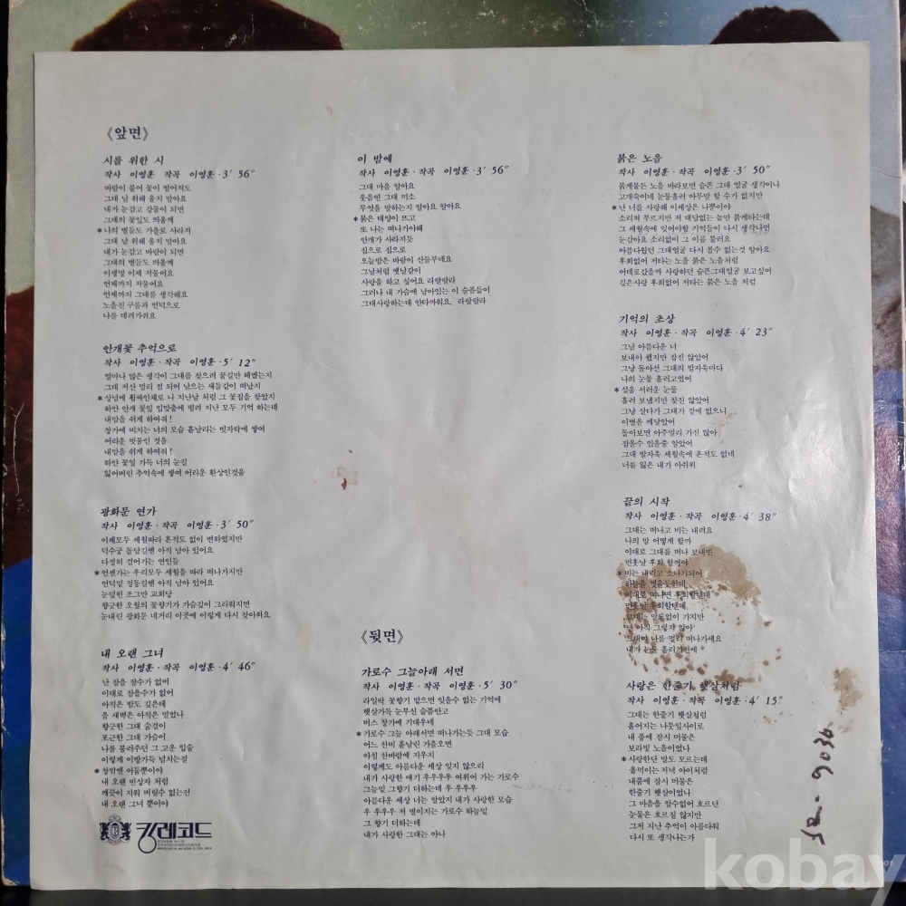 | 자켓상태 | EX : 약간의 마모, 모서리 찢김 존재 | 음반상태 | EX : 재생에 영향 없는 가벼운 기스 존재 | 발매정보 | 초반 | 가사지여부 | 유 |