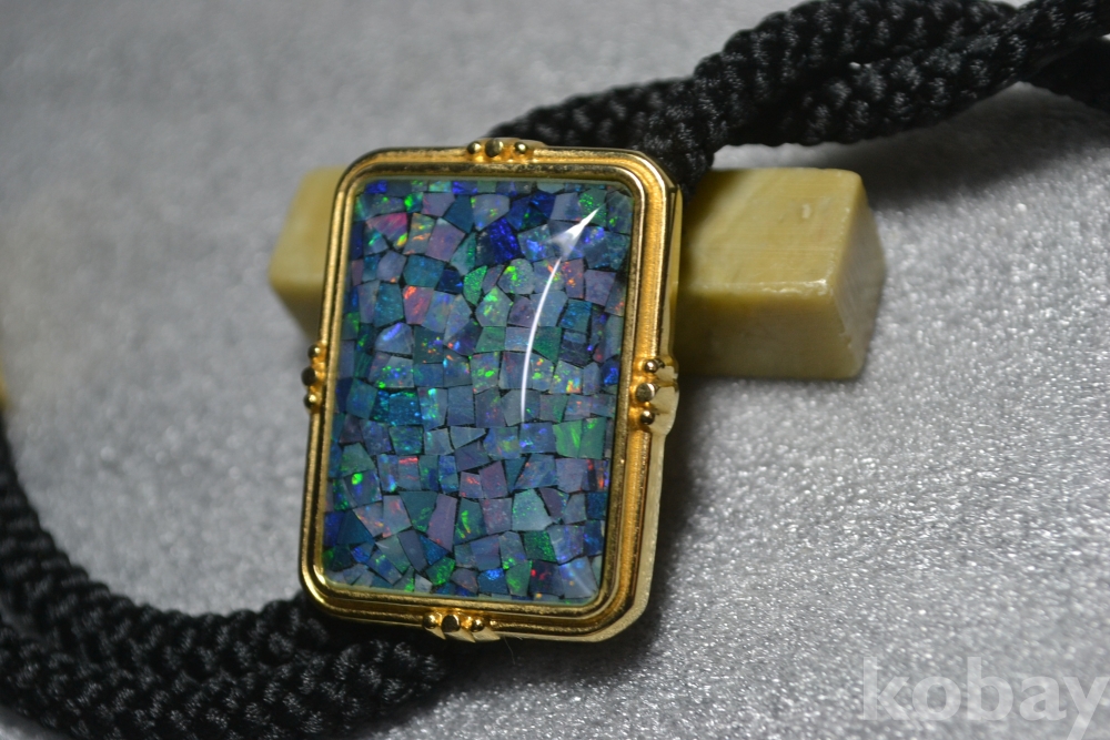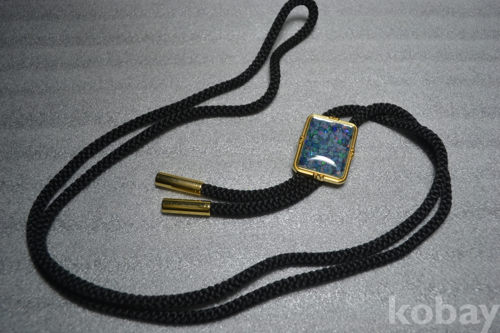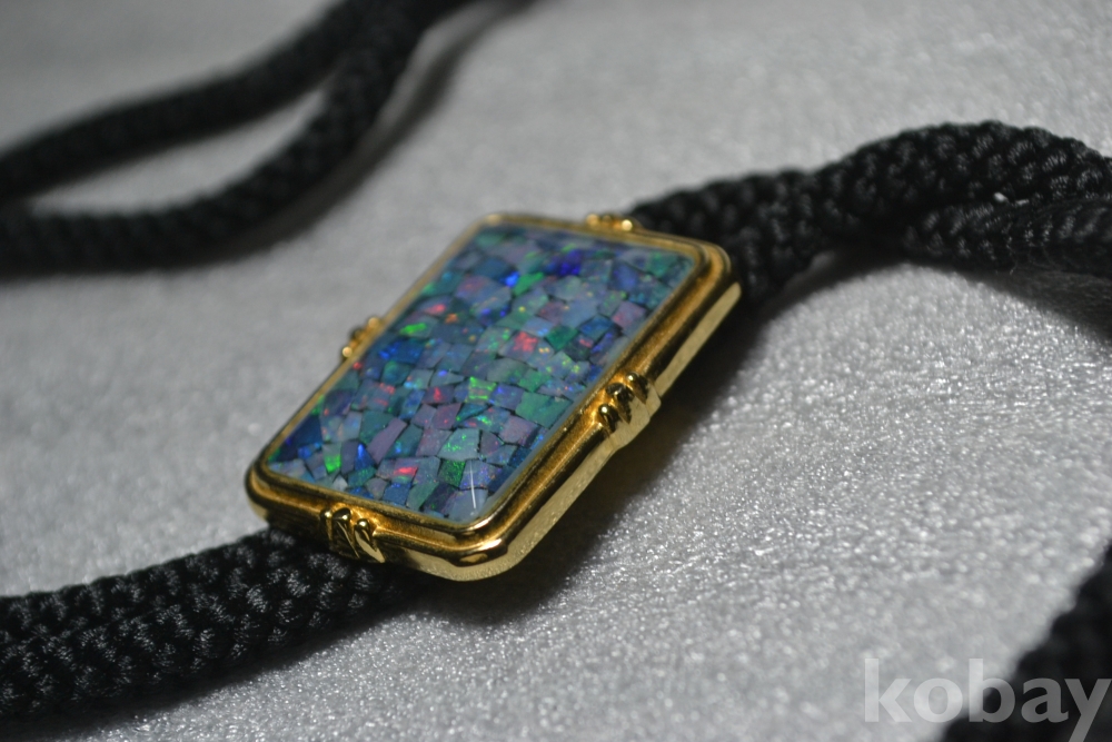 ㅡ> 사진으로 보시는대로 묵직하고 튼튼한 금장도금 메탈베이스판위에 섬세하고 아름다운 화려한 색채의 조각형 오팔보석들이 모자이크식으로 정교하게 짜맞추어진 디자인의 아름다운 고급 모자이크 오팔보석 루프타이 작품 입니다. (사진참조)