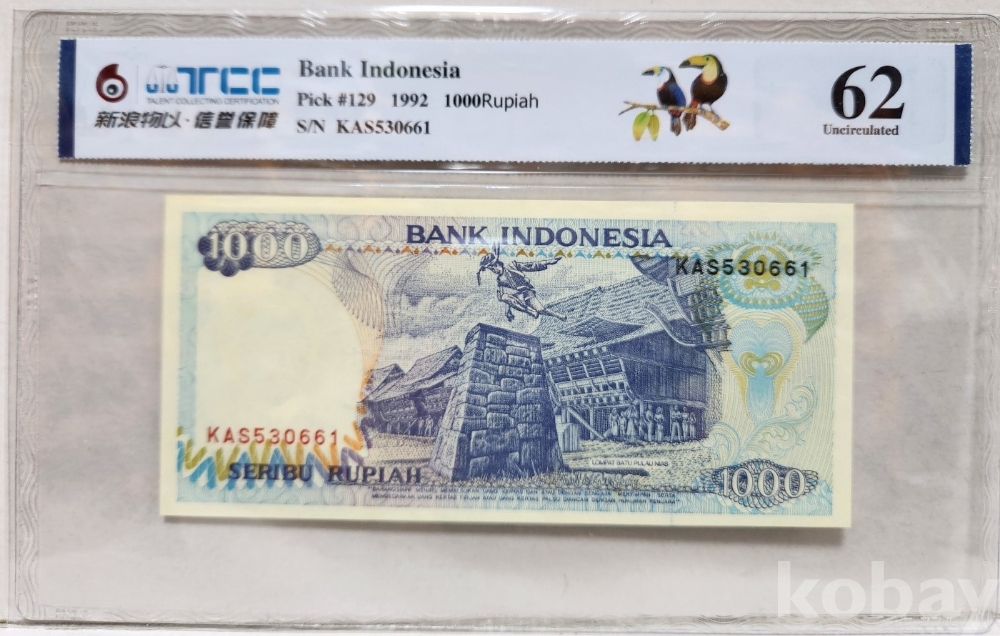 -1992년 인도네시아 1000루피아 지폐 TCC62 등급 입니다.